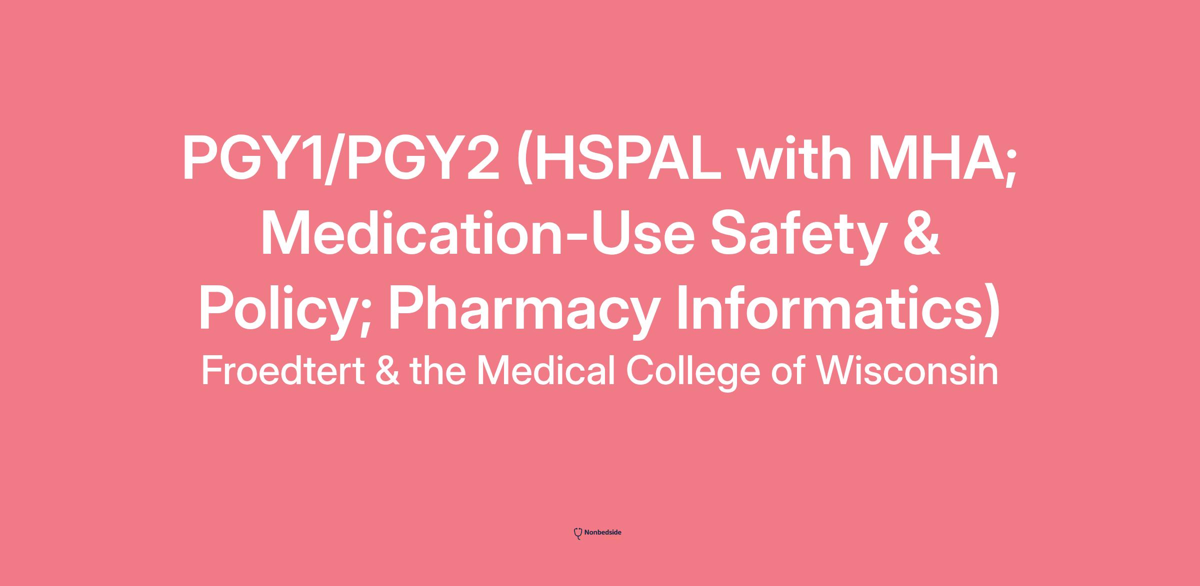 PGY1/PGY2 Pharmacy Informatics Residency (1 position) The PGY1&2 Pharmacy Informatics Residency program is 24 months. During the PGY1 year, the resident completes the requirements of the PGY1 Pharmacy Residency (Acute Care). During the PGY2 year, the resident completes the PGY2 program described below. More details about the program are available here: https://www.froedtert.com/pharmacy-residency/pgy1-pgy2-informatics