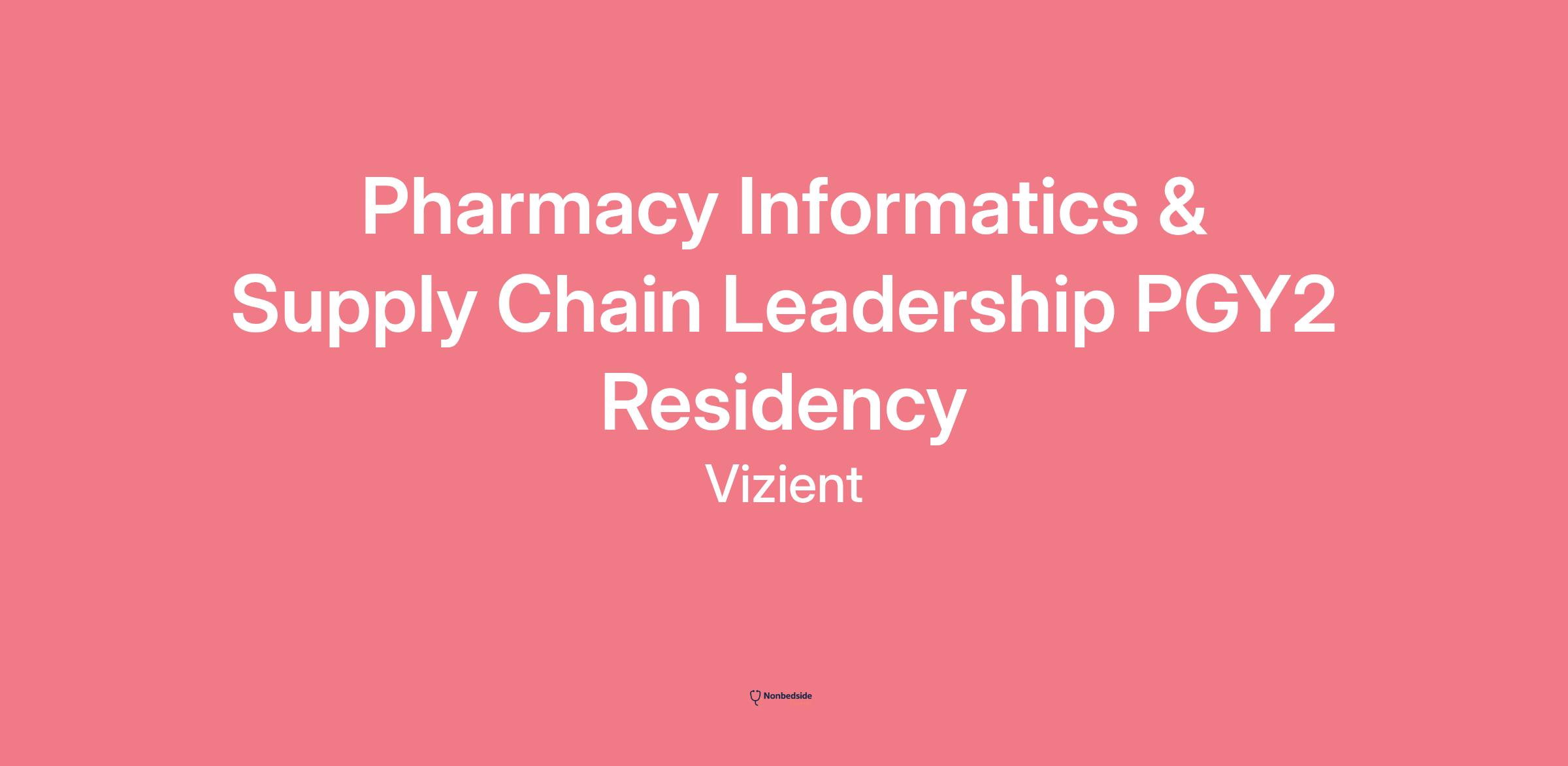 Overview Pharmacists who complete the Vizient PGY2 Pharmacy Informatics & Supply Chain Leadership Residency Program will be equipped with the knowledge and skills to leverage data effectively in the evolving medication use process. As a resident, you will develop a comprehensive understanding on the use of informatics from clinical, operational and leadership perspectives. You will engage with experienced preceptors and mentors with diverse backgrounds from health care to analytics, as well as leaders from Vizient client institutions. This unique opportunity to develop leadership, advanced programming and database management skills will enable you to become a leader in the informatics realm and prepare you to serve in a wide range of pharmacy related roles.