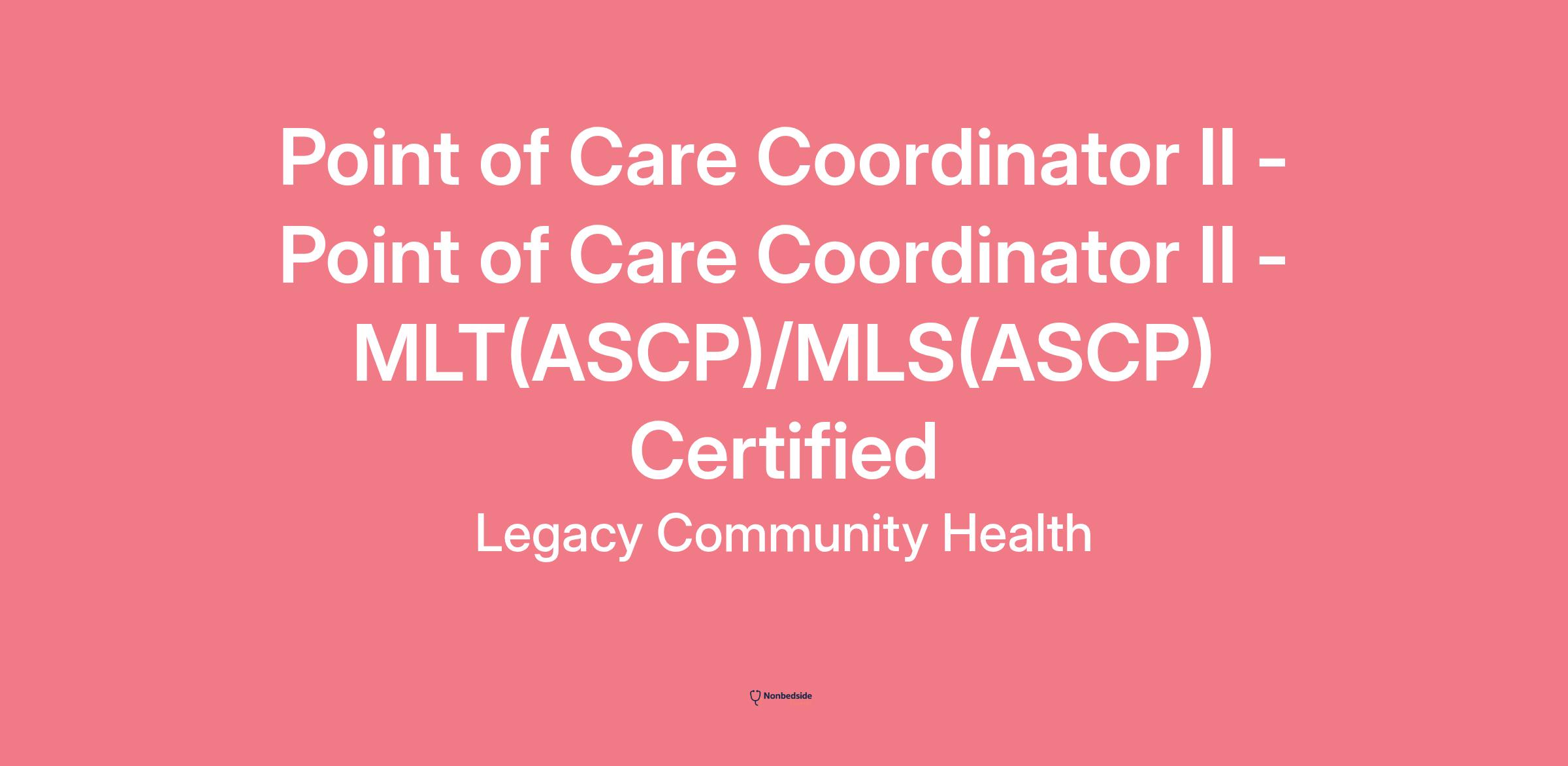 Point of Care Coordinator II - Point of Care Coordinator I – MLT(ASCP)/MLS(ASCP) Certified - Job OverviewSchedule: Monday-FridayAre you ready to dive into an exciting role as a Point of Care Testing Coordinator I at Legacy Community Health? Get set to make a splash in the world of community healthcare!