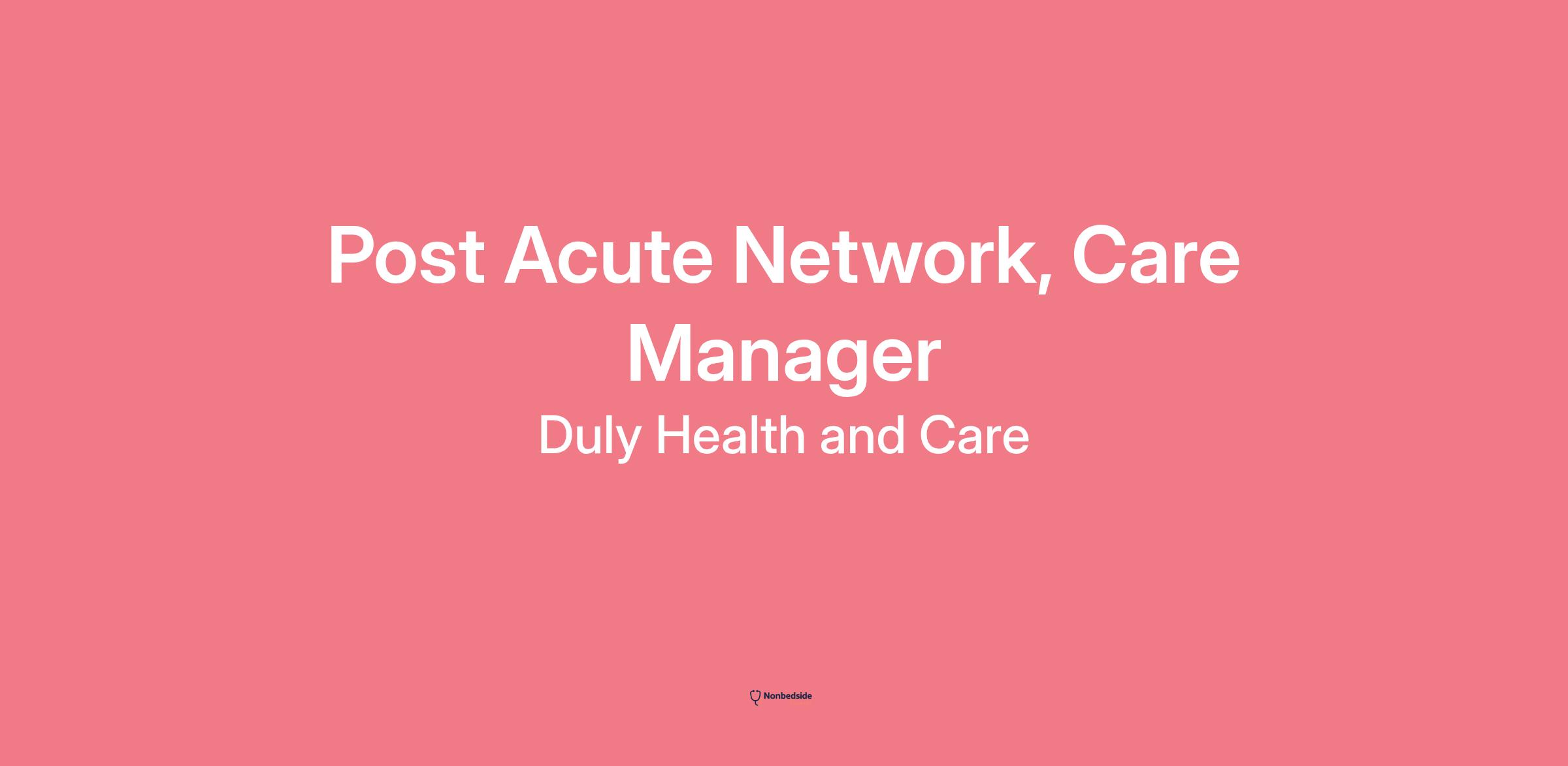 Duly’s Value‑Based Care organization is dedicated to transforming healthcare delivery by emphasizing quality outcomes and a patient‑centric approach. The Post Acute Network Care Manager works with skilled nursing facilities to promote quality outcomes for patients with complex medical needs, ensuring appropriate level‑of‑care, and preventing readmissions.