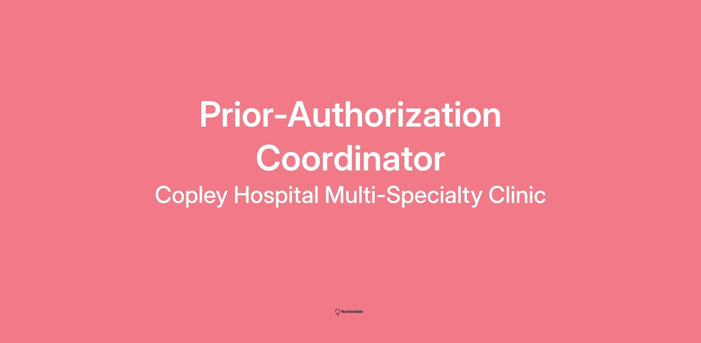 Overview Copley Hospital, located in Morrisville/Stowe VT, is in search of a Prior-Authorization Coordinator to join our team! The Authorization Coordinator plays a key role in the patient experience and Revenue Cycle of the organization. This position will work with service providers and insurance companies to obtain all necessary prior authorizations. To be successful in this position you will need to thrive in a fast-paced environment, be detail-oriented, flexible, highly organized, self-motivated, and provide outstanding service to both internal and external customers. Being a positive team player is a must.