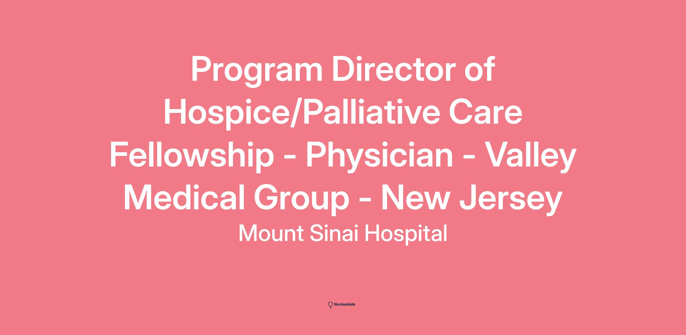 Job DescriptionValley Health System in affiliation with the Icahn School of Medicine at Mount Sinai is actively recruiting a Program Director for Hospice and Palliative Care Fellowship.About Valley Health SystemValley Health System is one of the largest and most honored healthcare providers in New Jersey. Newsweek has recognized us as one of the world's 1,000 best hospitals and one of the 250 best hospitals in the United States. The Valley Health System is a High-Reliability Organization dedicated to safety, quality, and satisfaction, ensuring an outstanding patient and community experience. It serves as the parent corporation for The Valley Hospital, The Valley Hospital Foundation, Valley Home Care, Valley Medical Group, ColigoCare, and Valley Research Institute. Prestigious alliances with Cleveland Clinic's Heart, Vascular & Thoracic Institute and the Mount Sinai Health System mean our doctors collaborate with the top physician leaders in medicine today.