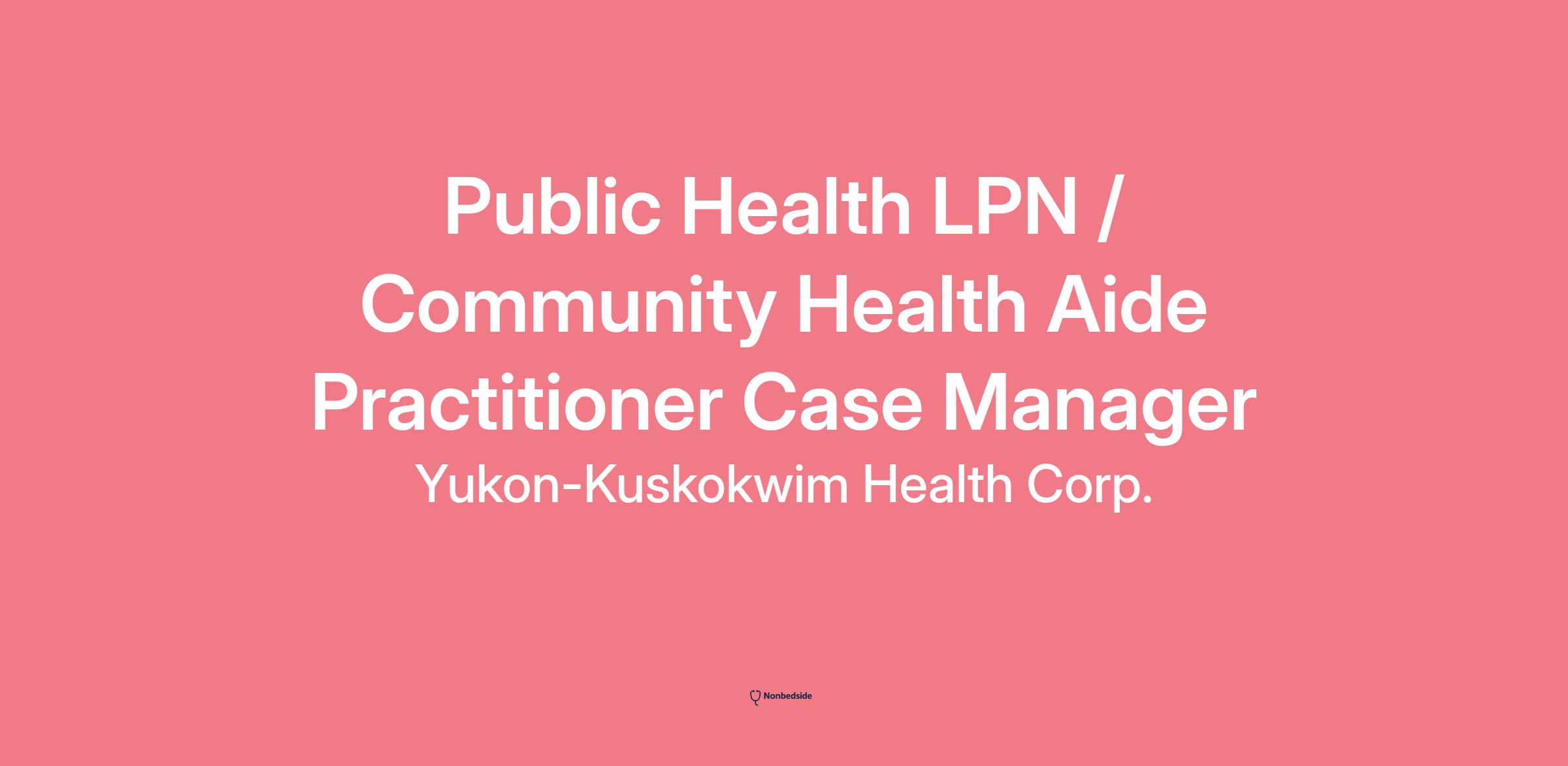 Public Health LPN / Community Health Aide Practitioner Case Manager Join to apply for the Public Health LPN / Community Health Aide Practitioner Case Manager role at Yukon-Kuskokwim Health Corporation.