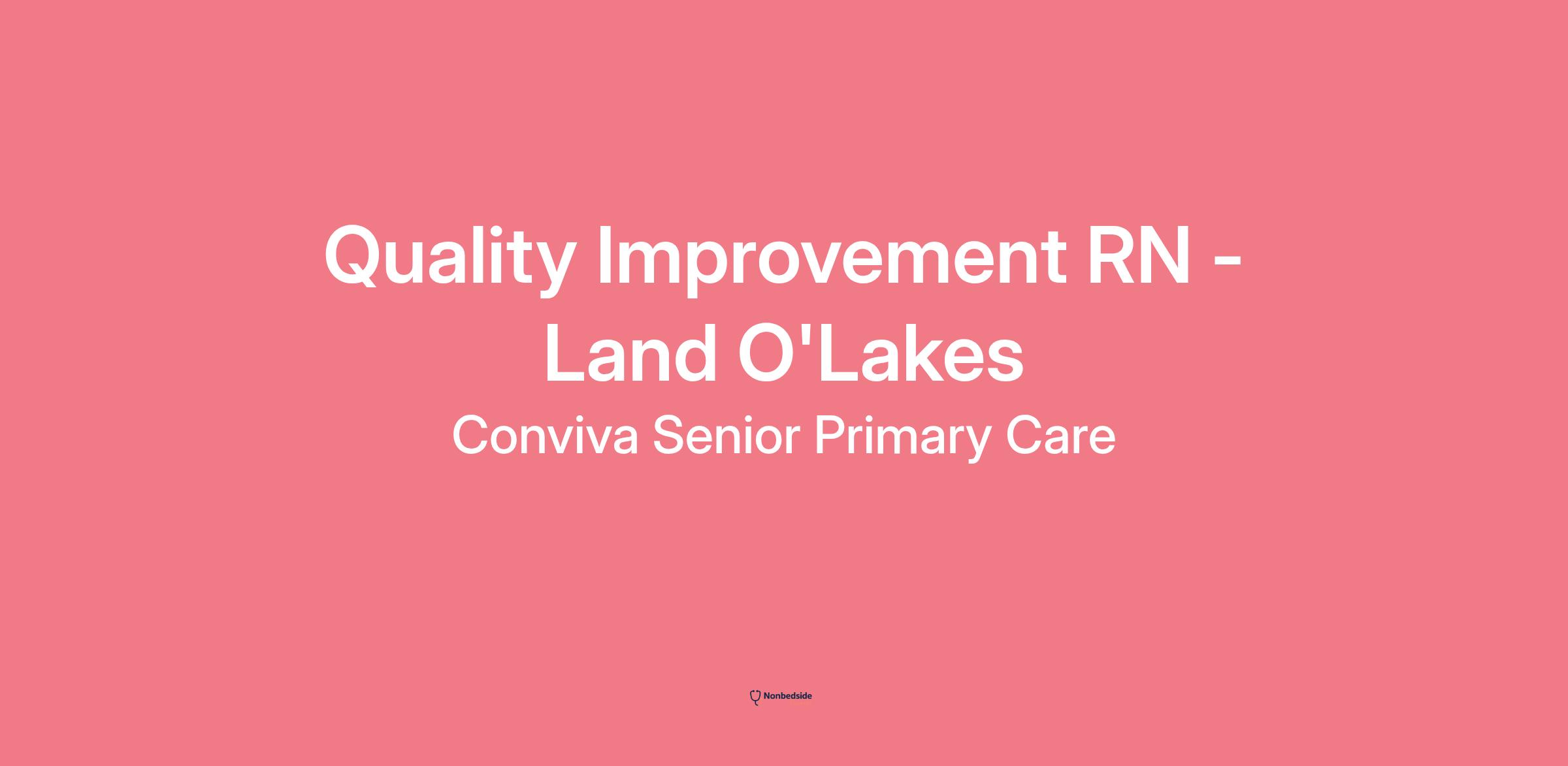 Overview Quality Improvement RN - Land O'Lakes role at Conviva Senior Primary Care. Base pay range $71,100.00/yr - $97,800.00/yr. This role collaborates with market leadership and quality improvement team to develop and implement programs designed to improve patient outcomes. Work is performed within the provider’s primary center location and in collaboration with Quality Improvement Coordinators and Professionals and in close partnership with market and center teams. Patient interaction is required for this role and is completed both telephonically and through in-person visits for activities such as patient education and point-of-care testing and screenings (including Retinavue eye exams, HgA1c draws, etc.).