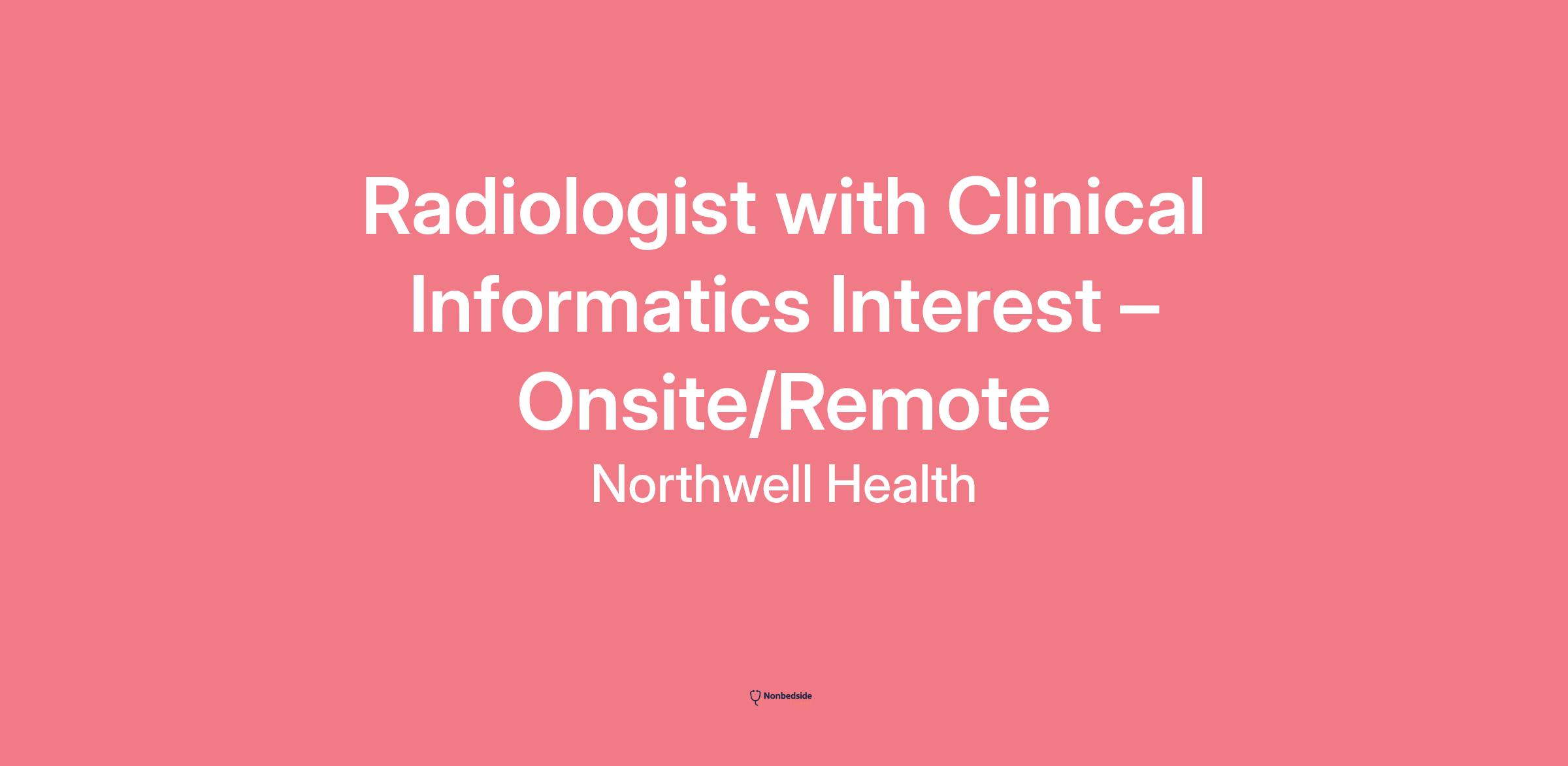 The Department of Radiology at Northwell Health is seeking a Board Certified/Board Eligible radiologist with a strong interest in informatics to join our team. Candidates are encouraged to apply for this role to work on site or remote.
