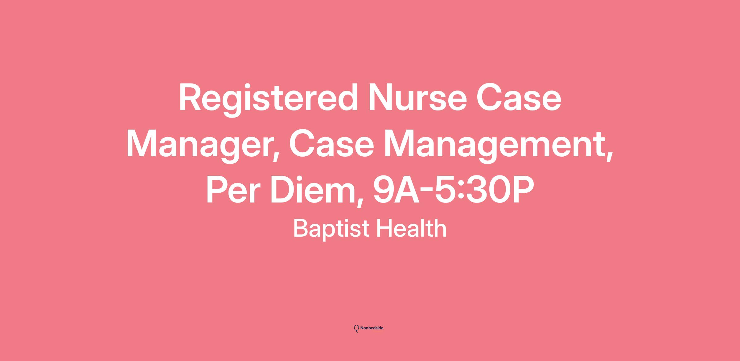 Overview Join to apply for the Registered Nurse Case Manager, Case Management, Per Diem, 9A-5:30P role at Baptist Health .