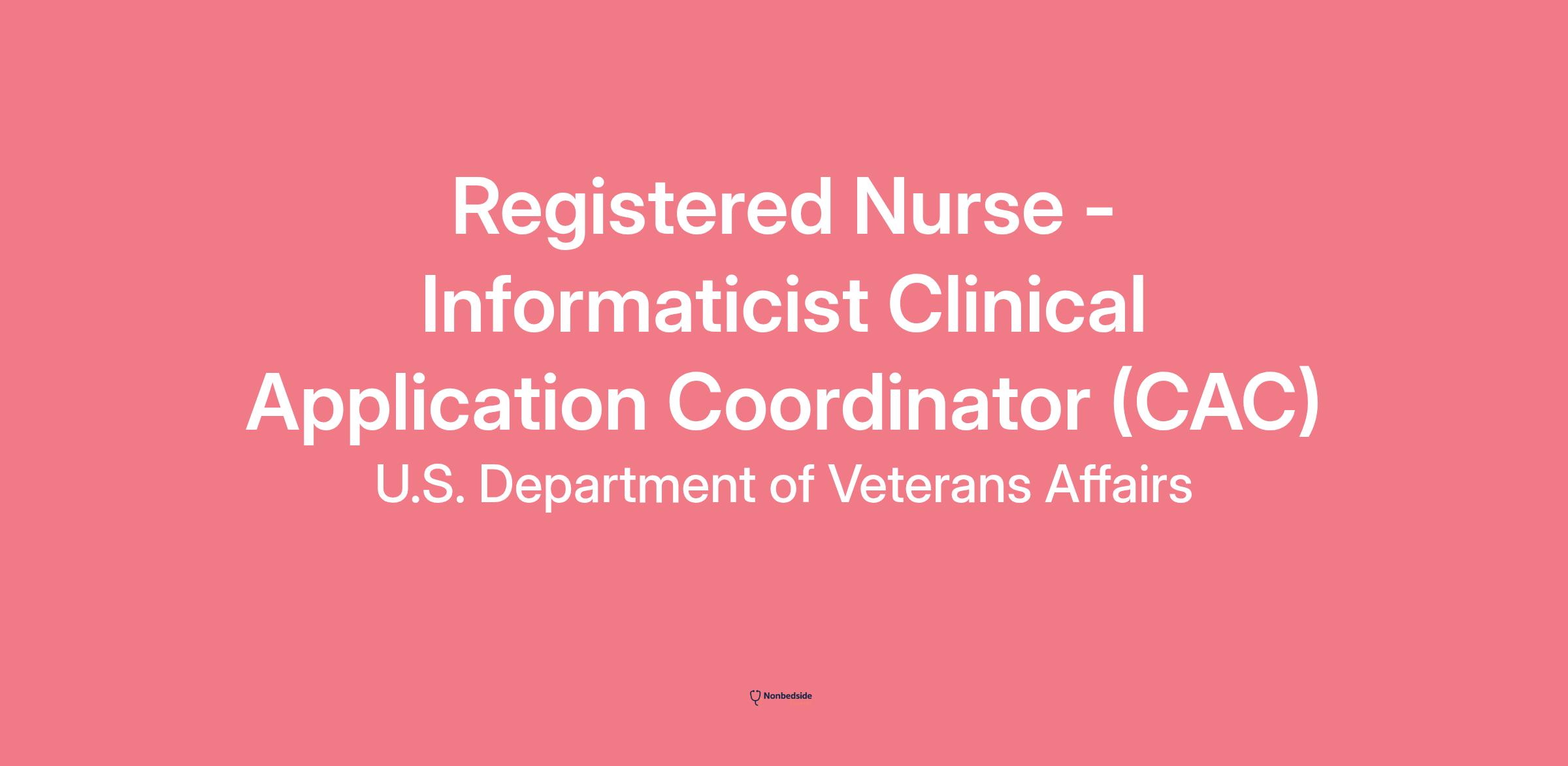 Registered Nurse - Informaticist Clinical Application Coordinator (CAC) Location: Clement J. Zablocki VA Medical Center, Milwaukee, WI – Clinical Informatics & Medical Technology (CLIMET) Division.
