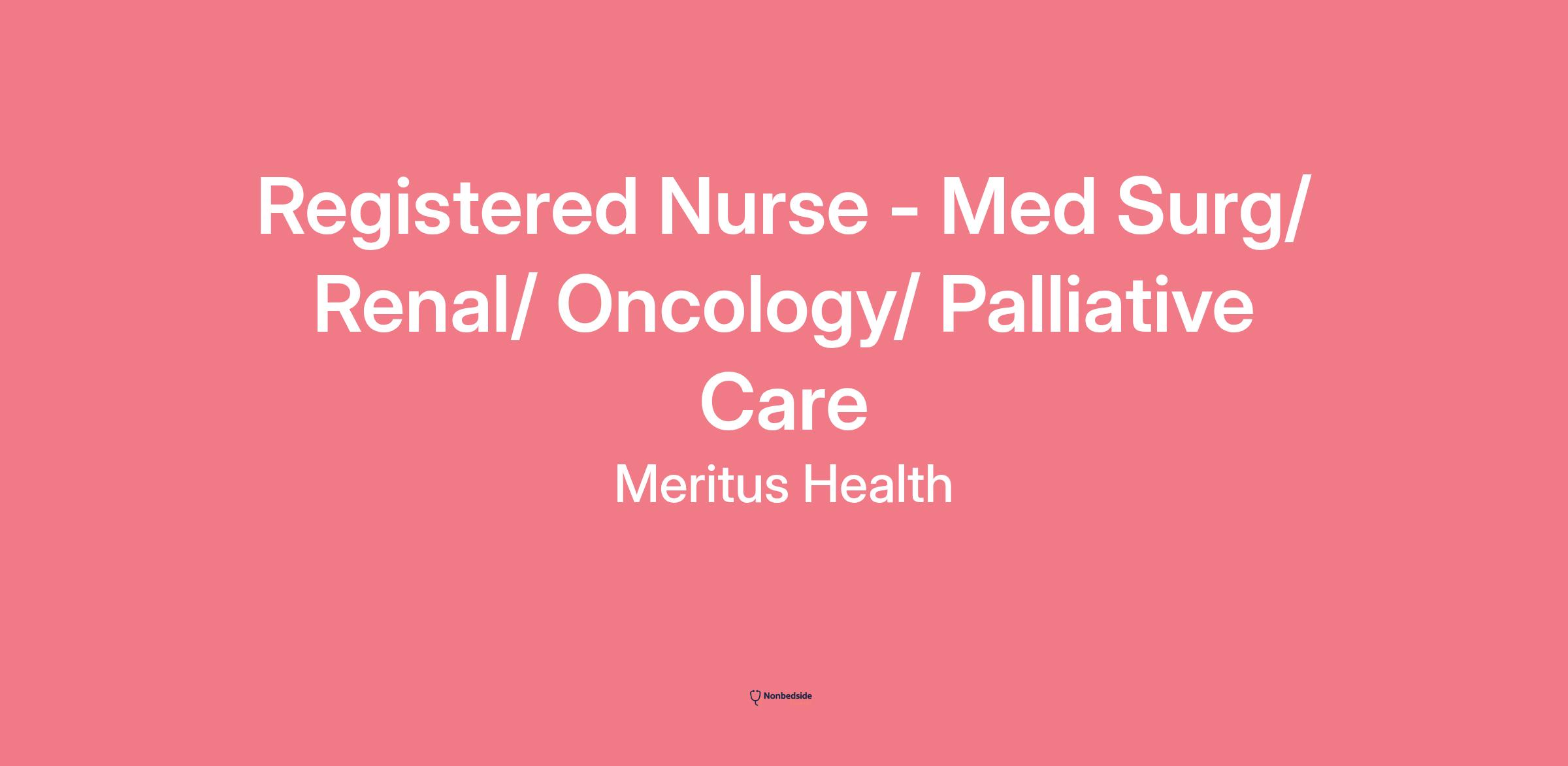 Registered Nurse - Med Surg/ Renal/ Oncology/ Palliative Care Join to apply for the Registered Nurse - Med Surg/ Renal/ Oncology/ Palliative Care role at Meritus Health