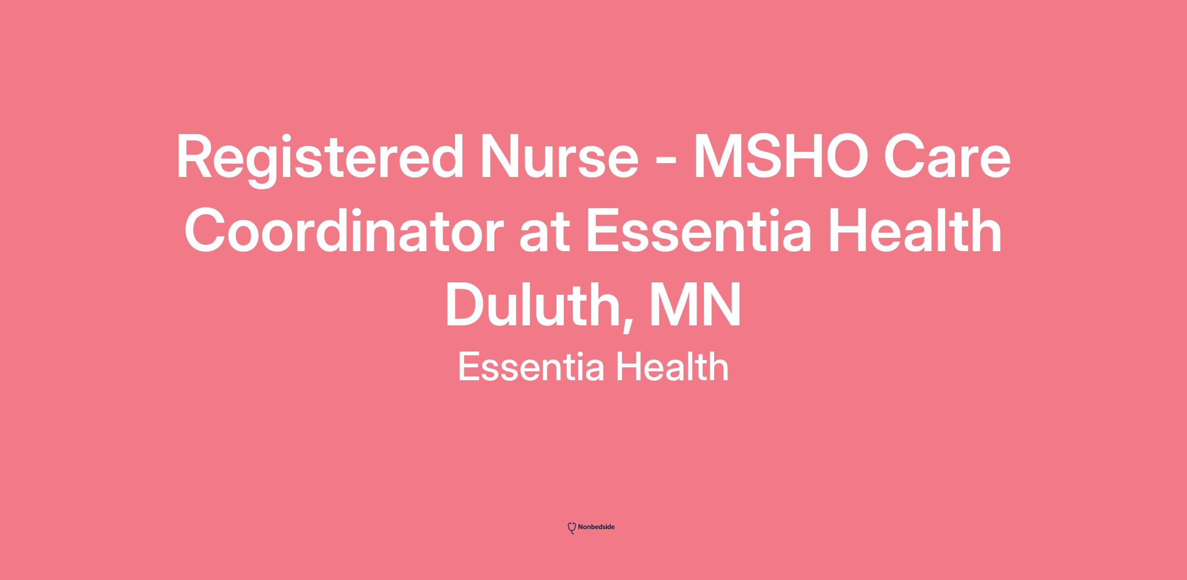 Registered Nurse - MSHO Care Coordinator job at Essentia Health. Duluth, MN. Job Description: Works with patient populations identified as “at-risk” in collaboration with their interdisciplinary care team. Identifies and assists in closure of gaps in care related to preventive care, chronic disease care and regulatory services. Assists in delivery of high quality, efficient, and cost-effective healthcare services. Under general administrative direction, gives patient education related to their condition and planned treatment, promote patient self-management, suggests care plans with providers, manages transitions of care, etc. If MSHO Care Coordinator, duties include responsibility for assisting members of members enrolled in a dual eligible Minnesota Health Care Programs to make informed choices about their health care services, conducting assessments, service coordination, and assisting members in making progress towards his or her health goals and coordinating care with the interdisciplinary team. This includes making in-person visit to enrollees’ home. Education Qualifications: This position is remote but does require home visits for clients in and around the Duluth area. The ideal applicant would be located in Duluth or within 30 minutes.