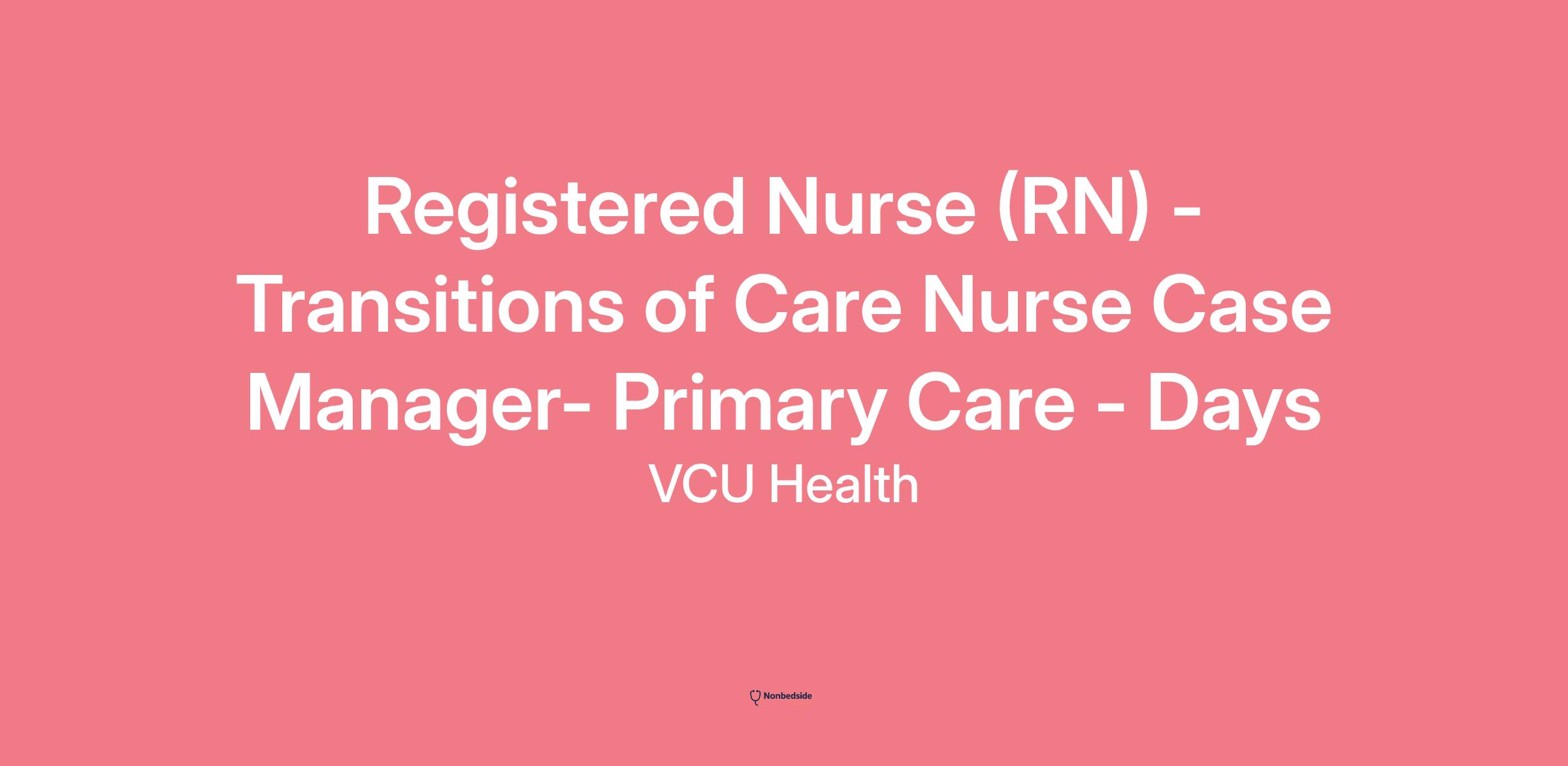 Join to apply for the Registered Nurse (RN) - Transitions of Care Nurse Case Manager - Primary Care - Days role at VCU Health .
