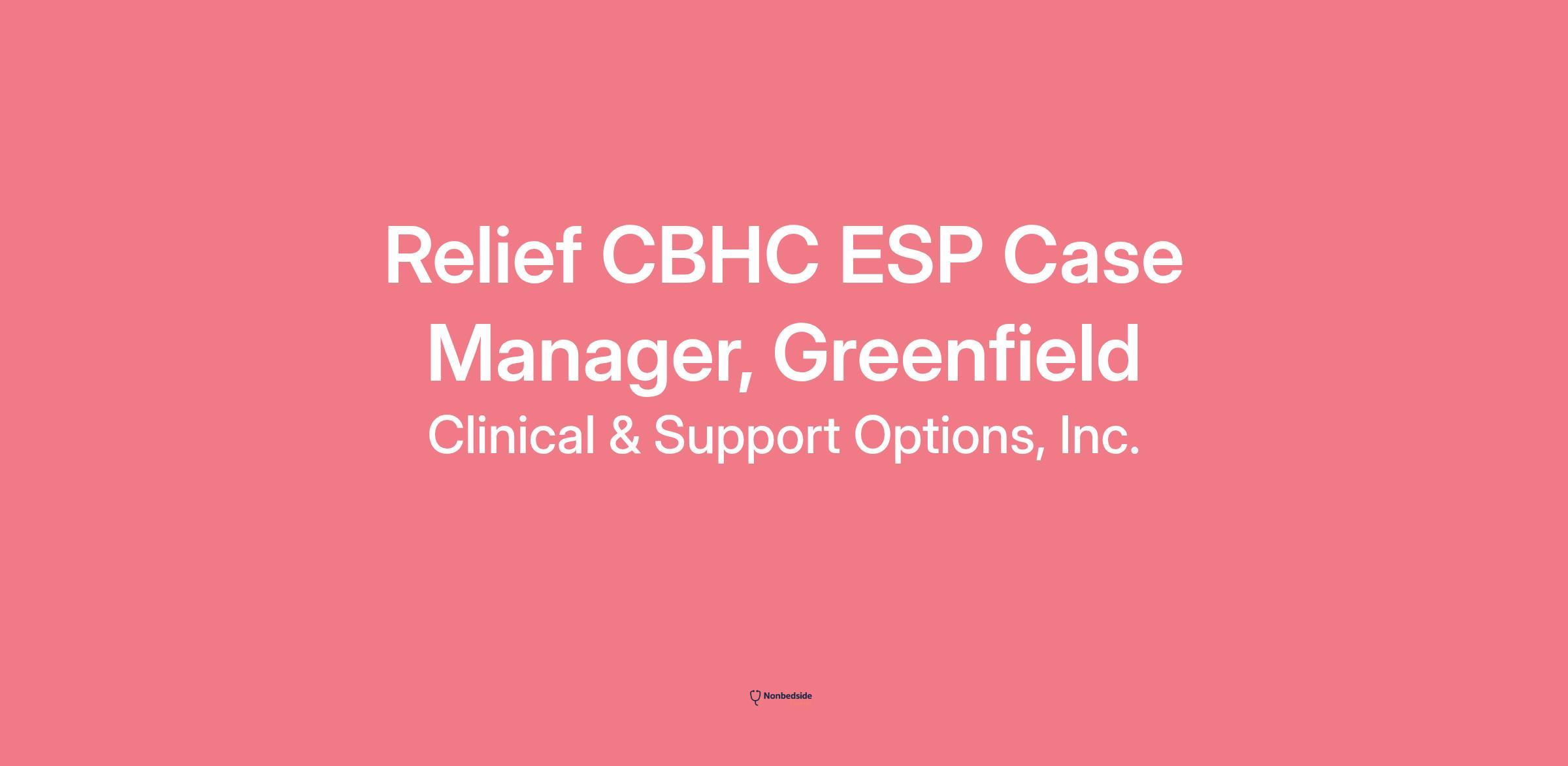 Overview Relief CBHC ESP Case Manager, Greenfield. CSO is looking for Case Managers to work in our CBHC (Community Behavioral Health Clinic) Emergency Services Program (ESP) in Greenfield. Our Emergency Service Programs (ESPs) offer clients behavioral health assessments, intervention and stabilization (for youth, families and adults), 24-hour availability, and are a preferred alternative to hospital emergency departments. We provide daily assessment and brief counseling, case management, nursing support and peer support. This position will provide direct case management services to CBHC clients. Case management provides follow up support to individuals evaluated by CBHC program and who remain in the community after a Crisis assessment.
