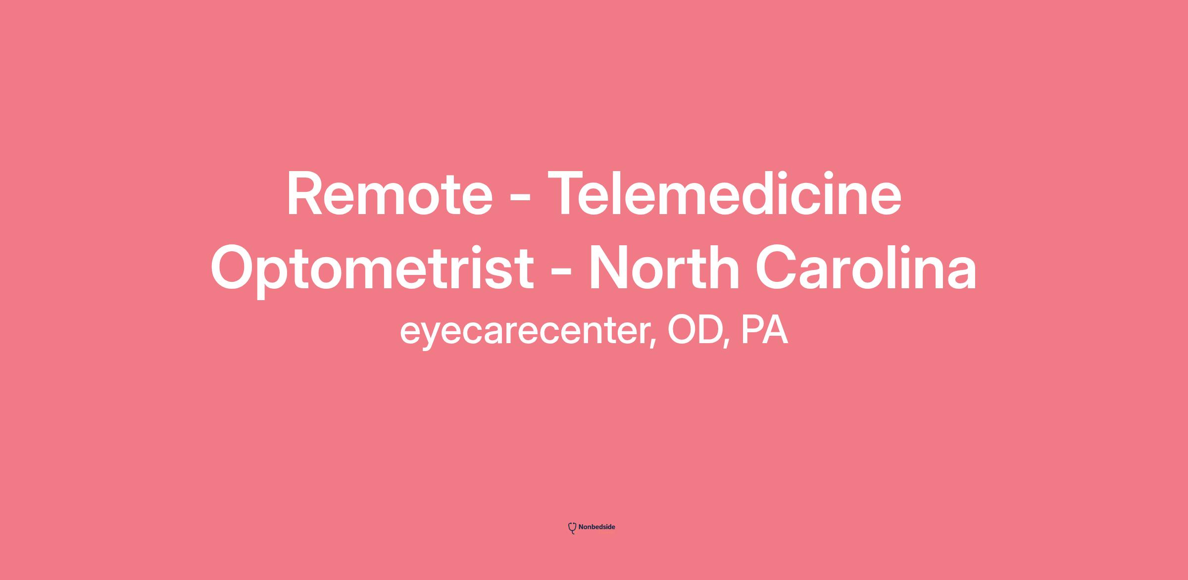 Overview Remote - Telemedicine Optometrist - North Carolina (Part-Time) at Eyecarecenter, OD, PA. This role provides comprehensive eye care remotely from a home office using secure, real-time telehealth technology, with in-office ophthalmic technicians supporting the process. You will evaluate patients' visual health, diagnose ocular conditions, and prescribe corrective lenses, communicating with patients via video conference and documenting findings in our proprietary EHR system.