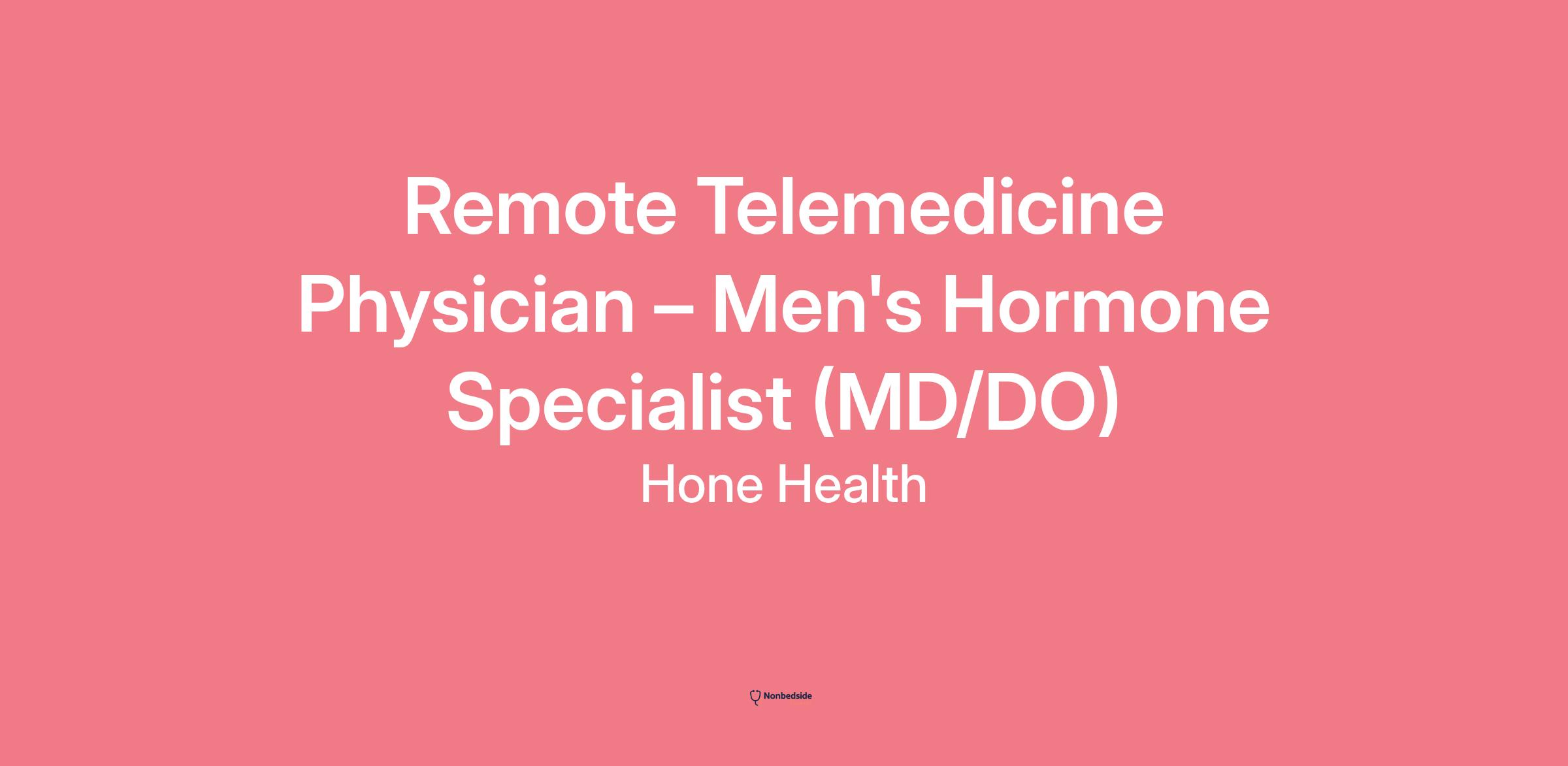 Overview Remote Telemedicine Physician – Men\u2019s Hormone Specialist (MD/DO) at Hone Health. Work 100% remotely, set your own schedule, and earn additional income while making a real difference in men\'s health and lives. We are a mission-driven team that focuses on hormone optimization for men, offering treatment through pharmaceuticals (per AUA-defined protocols), supplements, and lifestyle changes. Multi-state licensing is valued.
