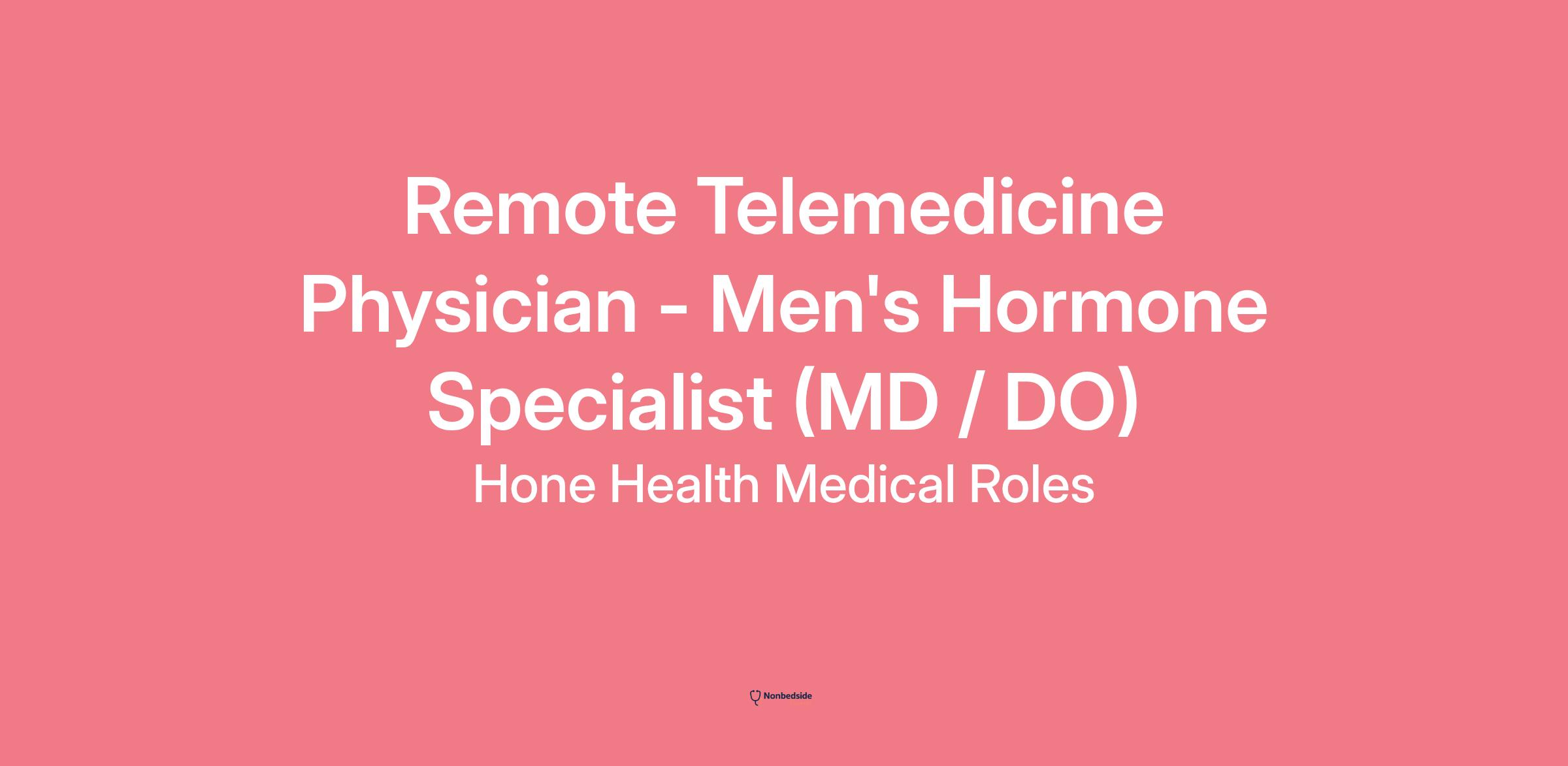 Overview Work 100% remotely, set your own schedule, and earn additional income while making a real difference in men\'s health and lives. Hone is one of the fastest-growing health companies in the United States, and we are looking for physicians who have deep knowledge and experience in prescribing for men with hypogonadism. If you are a physician with a strong background in treating hypogonadism and experience prescribing testosterone and other hormone-optimizing pharmaceuticals, this is an opportunity to join a mission-driven team that is reshaping access to care. We treat patients with a combination of pharmaceutical products in accordance with AUA-defined protocols, supplements, and lifestyle changes. We are committed to making care more convenient and affordable for patients. Experience with weight-loss and thyroid medications is a plus, as we have expanded beyond men\'s hormones into these treatment areas. We have also launched services for women. Experience with women\'s hormone therapy allows you to see our female patients as well, but is certainly not required. We are looking nationwide and value physicians licensed in multiple states.