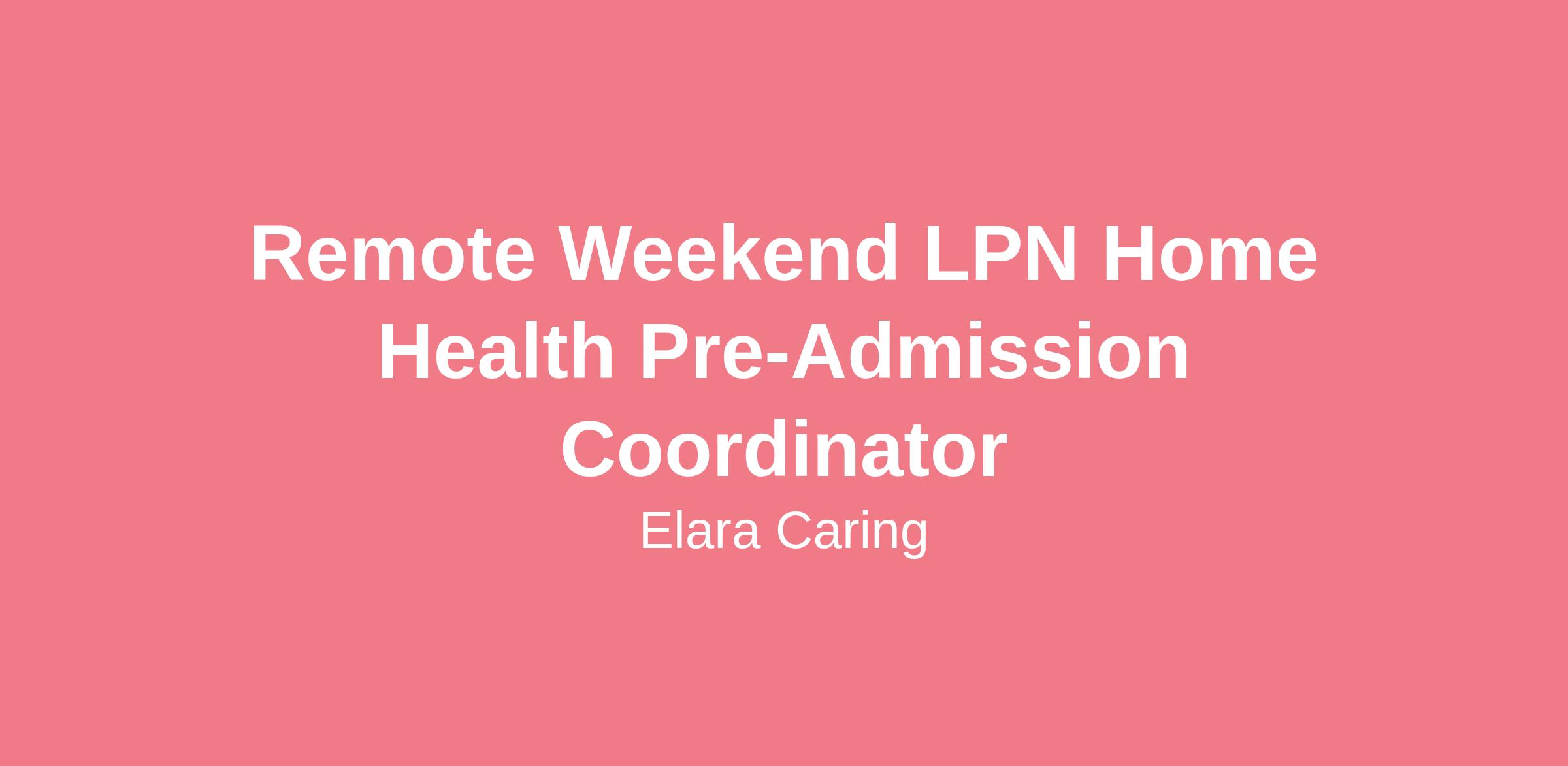 Delivering the right care, at the right time, in the right place is the mission that inspires Elara Caring, and that starts with the right people. Currently, we serve over 65,000 patients nationwide, with constant opportunities to have a significant influence in the lives of our patients and their families. This means you have countless ways to make a difference in your role as Pre-Admission Coordinator by helping your team to reach their full potential. Being a part of something this great starts by carrying out our mission every day through your true calling: supporting an amazing team of compassionate and dedicated healthcare providers.