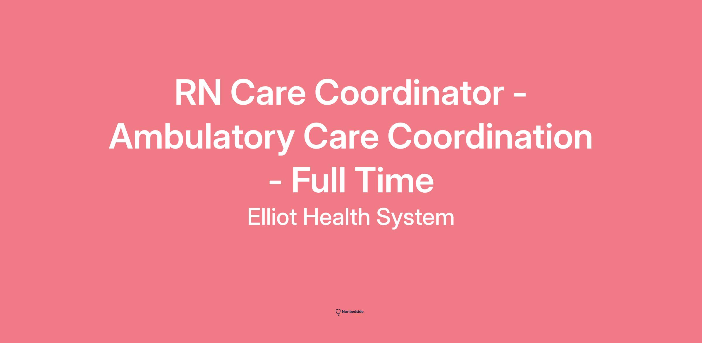 RN Care Coordinator - Ambulatory Care Coordination - Full Time page is loaded## RN Care Coordinator - Ambulatory Care Coordination - Full Timelocations: Manchester, NHtime type: Full timeposted on: Posted Yesterdayjob requisition id: JR9608Come work at the best place to give and receive care!**Job Description:****About the position - M - F 8 - 5pm**The Nurse Care Coordinator organizes team-based care planning to provide support and comprehensive health services to individuals, mainly focusing on individuals with higher risk and complex needs, through effective partnerships with patients, their caregivers/families, community resources, and their healthcare providers. Performs short term transitional care activities and longer-term care planning for complex patients through facilitation of a shared care plan across the continuum of care to achieve well-coordinated, timely, cost effective, high-quality care that is patient and family centered.**Responsibilities:*** Manages a panel of active patients requiring complex care management and care coordination support* Collaborates with the multidisciplinary team, including the patient and their family, to design and implement holistic individualized plans of care for patients enrolled in care coordination programs* Communicates necessary and important information to physicians, supervisors, patients, and staff* Assess patient and family’s unmet health and social needs as well as health literacy and identifies strategies to resolve needs* Provides care coordination support across settings and transitions of care including discharges from acute and post-acute settings, specialty settings and provider transitions**Requirements:*** Graduate of an accredited school of nursing. Bachelor of Science in Nursing, Preferred* Current New Hampshire, compact, or multistate licensure as Registered Nurse, Required* Specialty Certification i.e. ambulatory nursing, CCM, CCTM, Guided care, CHCQM, Preferred* 5+ years nursing experience in acute, skilled nursing, community health and/or ambulatory setting, Required**Why You’ll Love Us:*** Health, dental, prescription, and vision coverage for full-time & part-time employees* Short term, long term disability, Accident insurance, & life insurance* Tuition Reimbursement* Referral bonuses* Accrued earned time for full-time & part-time employees* 403b Retirement plans, with generous employer contributions* And more!**Work Shift:**8a-5p*SolutionHealth is an equal opportunity employer and all qualified applicants will receive consideration for employment without regard to race, color, religion, sex, sexual orientation, disability status, veteran status, or any other characteristic protected by law.*