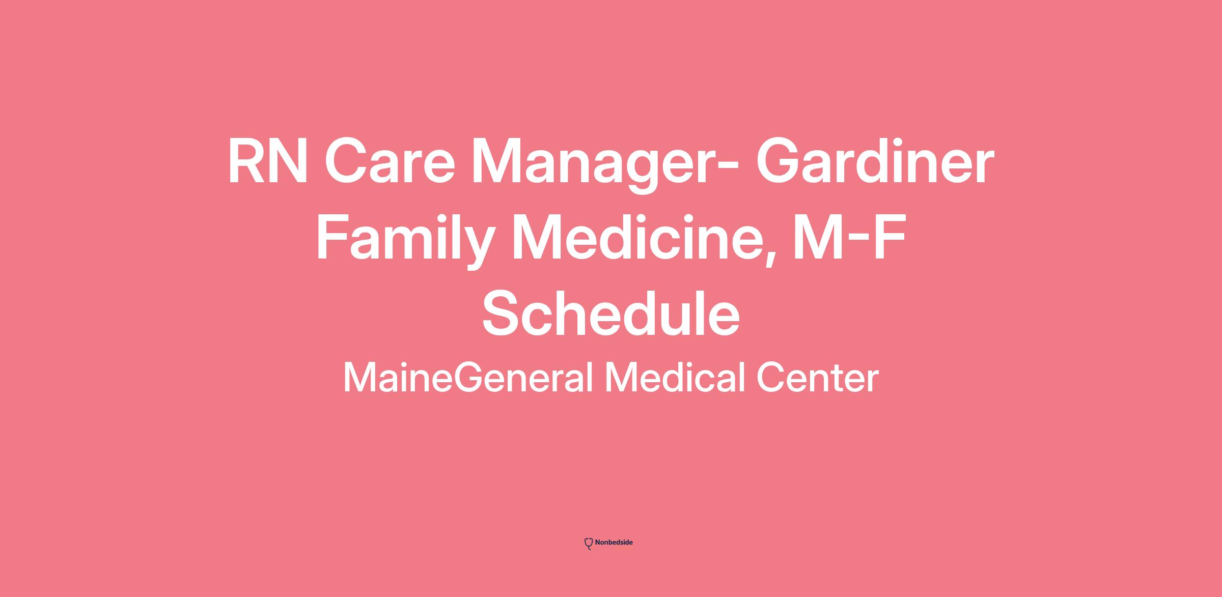 ## **Job Summary:**MaineGeneral Health is seeking a dedicated and proactive Registered Nurse (RN) Care Manager to join our team at Gardiner Family Medicine. In this role, you’ll work collaboratively with primary care providers and multidisciplinary teams to support patients with chronic and complex health conditions. Your work will be central to improving outcomes, enhancing the patient experience, and helping us deliver high-quality, value-based care.## **Job Description:****Position: RN Care Manager****Primary Location:** Ballard Center, Augusta **Schedule:** Full-time (40 hours/week), M-F**Shift:** Days**The Work:*** Interviews and assesses patients and/or patients' family, caregivers, and/or legal representatives.* Determines, prioritizes, provides, and/or arranges for needed internal and external services/interventions. Consults with multidisciplinary teams regularly to evaluate patients' status and appropriateness of medical care, including admission, length of stay, transfer, and discharge.* Participates in discharge planning, including coordinating patient transfers to other facilities and coordinating community resources. Provides discharge education and resource referrals to patients.* Performs chart review to identify actual or potential issues with service delivery, patient outcomes and satisfaction, compliance, cost, and reimbursement.**You Have:*** Active Maine RN licensure or ability to obtain same in a timely fashion.* At least 1 year of RN experience is preferred.* Previous Care Management experience preferred.* Excellent teamwork, communication, and collaboration skills.* Proven and demonstrated critical thinking skills.* **Comprehensive Benefits:** Health, dental, vision, and wellness programs* **Work-Life Balance:** Earned time off, paid parental leave, and more* **Financial Security:** 403(b) retirement plan with up to **4% company match*** **Career Growth:** Professional development and advancement opportunities* **Student Loan Assistance:** Potential reimbursement to help you thrive## **Scheduled Weekly Hours:**40## Scheduled Work Shift:Day (United States of America)## **Job Exempt:**No## BenefitsSupporting all aspects of our employees’ wellness – physical, emotional and financial – is a critical component of being a great place to work. With the wide range of benefits and programs available, employees have the resources they need to be well at every stage of life and plan for the future.## **Physical Wellness:*** We offer quality health, dental, and vision benefits and wellness programs and resources to provide employees access to resources for a healthy lifestyle and help manage health care costs.* Employees have access to industry-leading leave for new parents.* A generous earned time plan is offered to all employees - We believe employees need and deserve time away from work to observe holidays, be with family, go on vacation, or simply take care of themselves.## **Emotional Wellness:**When life gets challenging, employees have access to our Employee Assistance Program for employees and anyone in their household.## **Financial Wellness:*** An employee discount program is available to all employees for services provided by MaineGeneral Medical Center.* Loan Reimbursement is available for this position dependent upon current degree level. Please discuss benefit with the recruiter.* Tuition Reimbursement is available to all employees to further develop skills and career.* We offer eligible employees up to 2% of eligible pay in 403(b) company-matching contributions plus another 2% in the 401(a) retirement income plan.* Three insurance plans are available to protect your family from the sudden loss of income in the event of your death, terminal illness or serious injury from accident.* We offer both short-term and long-term disability insurance to replace a portion of your income if you become disabled and cannot work for a period of time.**Career Mobility:** Helping our employees develop their skills and grow their careers is critical to how we retain our talent and sustain our business. We do this by offering our teammates a variety of leadership-supported programs and learning and development resources for every stage of their professional development. We know that our employees are our most valuable resource they are how we grow our business and care for our community.**Equal Opportunity Employer M/F/Vet/Disability** Assistive technologies are available. Application assistance for those requesting reasonable accommodation to the career site is available by contacting HR at (207) 861-3440 .