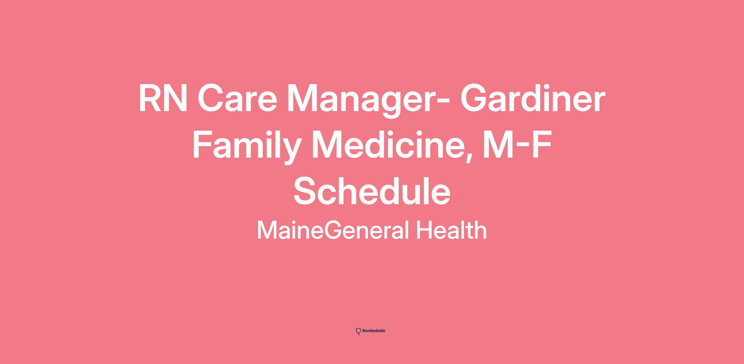 Job Summary: MaineGeneral Health is seeking a dedicated and proactive Registered Nurse (RN) Care Manager to join our team at Gardiner Family Medicine. In this role, you’ll work collaboratively with primary care providers and multidisciplinary teams to support patients with chronic and complex health conditions. Your work will be central to improving outcomes, enhancing the patient experience, and helping us deliver high-quality, value-based care. Job Description: Position: RN Care Manager