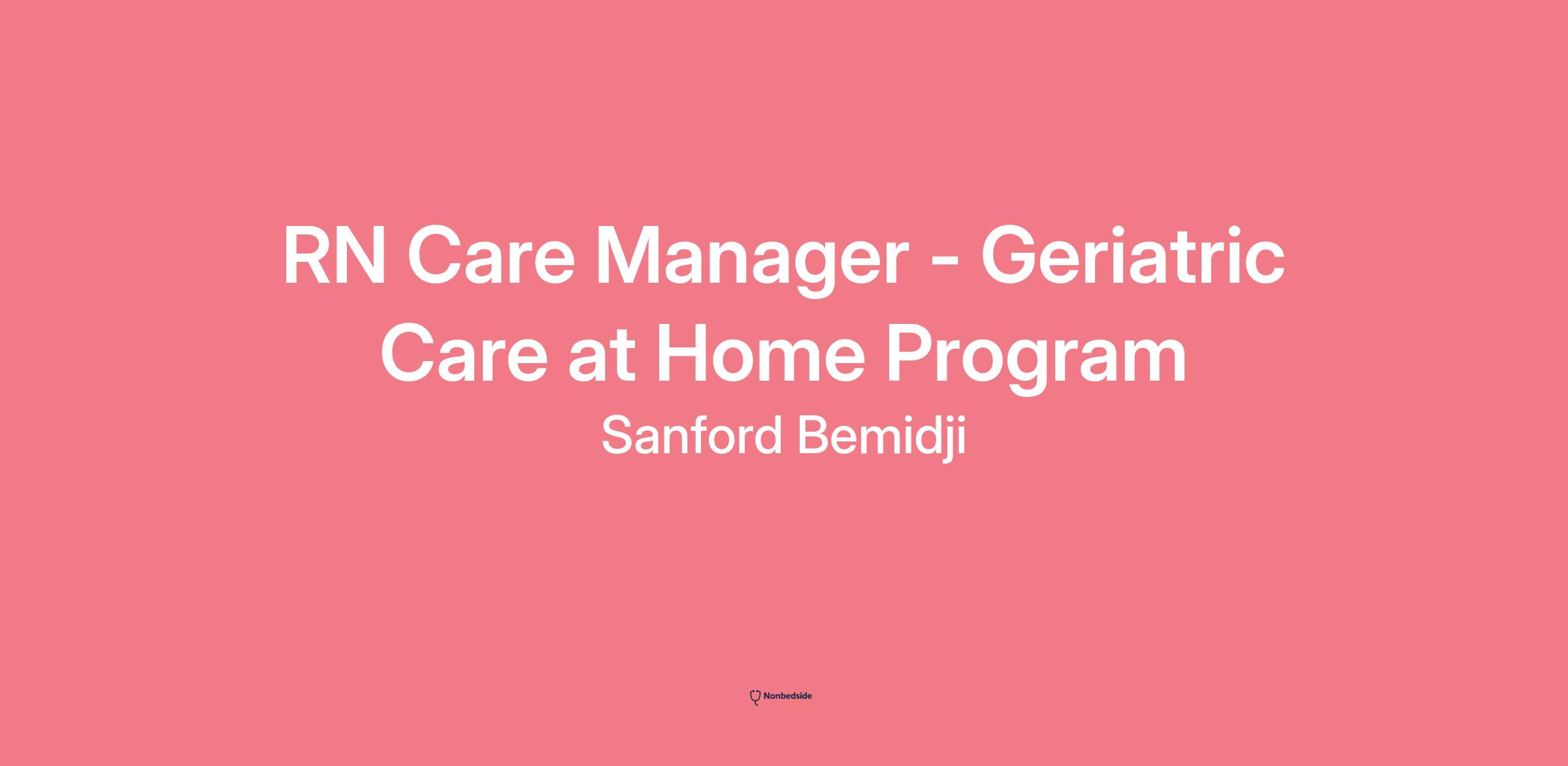 # Careers With PurposeRN Care Manager - Geriatric Care at Home Program page is loaded## RN Care Manager - Geriatric Care at Home Programlocations: ND, Fargotime type: Full timeposted on: Posted Todayjob requisition id: R-0236339**Sanford Health is one of the largest and fastest-growing not-for-profit health systems in the United States. We’re proud to offer many development and advancement opportunities to our nearly 50,000 members of the Sanford Family who are dedicated to the work of health and healing across our broad footprint.**Work Shift:8 Hours - Day Shifts (United States of America)Scheduled Weekly Hours:40Salary Range: $32.00 - $48.00. $10,000 Sign On Bonus available for Qualified Candidates!**Union Position:**No**Department Details**The Geriatric Care at Home Program currently supports 115 patients aged 65+ by providing clinic visits in the comfort of the patient's own home. The RNCM works closely with patients and their families, calls and questions, making home visits independently as well as with the clinician. Responsibilities include screening applicants to the program, managing schedules and orders, working closely with the providers and community resources. Ambulatory EPIC experience preferred. BSN required. Monday through Friday day shift schedule.**Summary**Responsible for utilizing the nursing process (assessment, diagnosis, outcomes/planning, implementation and evaluation) to provide individualized nursing care. Collects and relays information (assessment, screening, diagnostic testing results and risk stratification) to providers on both hospital and clinic patients enrolled in the approved programs.**Job Description**Develops and provides individualized patient education based on assessed needs. Develops and implements individualized care plan. Assists with the coordination of patient care across the continuum by collaborating with the inter-professional team and community partners. Works with the clinical team and may manage the disease registries by identifying and following up with patients not meeting clinical and evidenced-based goals as well as Sanford approved clinical guidelines. Provides services that focus on health and wellness. Provides healthcare leadership, coordination of services, and the implementation of evidence-based practice to support the overall goals of the designated setting and/or program. Applies population health care management strategies to panels of patients. Demonstrates competency and practices within the full scope of nursing expertise/knowledge and utilizes appropriate age and population specific standards as designated in their assigned clinical setting. Functions within the scopes and standards of nursing practice as outlined in the Nurse Practice Act and Administrative Rules in state of practice and licensure. The Sanford Professional Nursing Practice recognizes the Scope and Standards of Practice and the Code of Ethics for Nurses with Interpretive Statements as published by the American Nurses Association as the foundation of nursing care delivery and professional conduct.**Qualifications**Bachelor's degree in Nursing strongly preferred in Bemidji and Rapid City. Required in Fargo and Sioux Falls (Sanford USD Medical Center and Clinics). Required in Bismarck or enrolled and starting a Bachelor’s degree program within one year of hire with a completion date within three years upon date of hire into position. Required in Fargo Network and Sioux Falls Network, or employees hired after January, 2025, who do not possess a Bachelor’s degree in the required field, leadership may consider an educational plan with proven continuous action toward achieving a Bachelor’s degree in Nursing within five years of hire into position. Approval from the Nursing Executive for the market is required in order to waive the bachelor degree requirement (at time of hire). Additionally, for Rural Health Network facilities, for current employees, leadership may have considered acceptable qualifications and work experience equivalency based on facility size, rural market, and business need, prior to new Sanford education requirements.Graduate from an accredited nursing program, including, but not limited to, those accredited by the Commission on Collegiate Nursing Education (CCNE), Accreditation Commission for Education in Nursing (ACEN), or National League for Nursing Commission for Nursing Education Accreditation (NLN CNEA). Minimum of two years’ clinical experience preferred. Currently holds an unencumbered RN license with the State Board of Nursing where the practice of nursing is occurring and/or possess multistate licensure if in a Nurse Licensure Compact (NLC) state. Obtains and subsequently maintains required department specific competencies and certifications.Basic Life Support (BLS) is required and must be obtained within six months of employment.Must possess a valid driver’s license.**Sanford is an EEO/AA Employer M/F/Disability/Vet.****If you are an individual with a disability and would like to request an accommodation for help with your online application, please call 1-877-673-0854 or send an email to talent@sanfordhealth.org.**