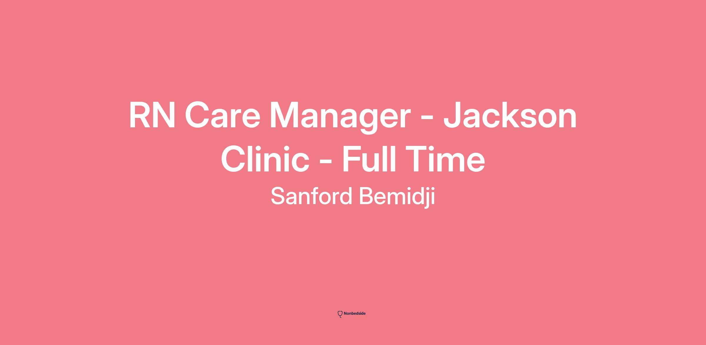 # Careers With PurposeRN Care Manager - Jackson Clinic - Full Time page is loaded## RN Care Manager - Jackson Clinic - Full Timelocations: MN, Jackson: MN, Lakefieldtime type: Full timeposted on: Posted Todayjob requisition id: R-0235971**Sanford Health is one of the largest and fastest-growing not-for-profit health systems in the United States. We’re proud to offer many development and advancement opportunities to our nearly 50,000 members of the Sanford Family who are dedicated to the work of health and healing across our broad footprint.**Work Shift:8 Hours - Day Shifts (United States of America)Scheduled Weekly Hours:36Salary Range: $32.00 - $48.00**Union Position:**No**Department Details**Join Our Team! We’re proud to offer a welcoming, close-knit team environment where collaboration and support are at the heart of everything we do. You’ll have the opportunity to work closely with providers and nursing staff at both the Jackson Clinic and the Lakefield Clinic. We’re currently seeking candidates who are passionate about Leadership in Quality and committed to making a difference. Apply today to learn more and take the next step in your career!**Summary**Responsible for utilizing the nursing process (assessment, diagnosis, outcomes/planning, implementation and evaluation) to provide individualized nursing care. Collects and relays information (assessment, screening, diagnostic testing results and risk stratification) to providers on both hospital and clinic patients enrolled in the approved programs.**Job Description**Develops and provides individualized patient education based on assessed needs. Develops and implements individualized care plan. Assists with the coordination of patient care across the continuum by collaborating with the inter-professional team and community partners. Works with the clinical team and may manage the disease registries by identifying and following up with patients not meeting clinical and evidenced-based goals as well as Sanford approved clinical guidelines. Provides services that focus on health and wellness. Provides healthcare leadership, coordination of services, and the implementation of evidence-based practice to support the overall goals of the designated setting and/or program. Applies population health care management strategies to panels of patients. Demonstrates competency and practices within the full scope of nursing expertise/knowledge and utilizes appropriate age and population specific standards as designated in their assigned clinical setting. Functions within the scopes and standards of nursing practice as outlined in the Nurse Practice Act and Administrative Rules in state of practice and licensure. The Sanford Professional Nursing Practice recognizes the Scope and Standards of Practice and the Code of Ethics for Nurses with Interpretive Statements as published by the American Nurses Association as the foundation of nursing care delivery and professional conduct.**Qualifications**Bachelor's degree in Nursing strongly preferred in Bemidji and Rapid City. Required in Fargo and Sioux Falls (Sanford USD Medical Center and Clinics). Required in Bismarck or enrolled and starting a Bachelor’s degree program within one year of hire with a completion date within three years upon date of hire into position. Required in Fargo Network and Sioux Falls Network, or employees hired after January, 2025, who do not possess a Bachelor’s degree in the required field, leadership may consider an educational plan with proven continuous action toward achieving a Bachelor’s degree in Nursing within five years of hire into position. Approval from the Nursing Executive for the market is required in order to waive the bachelor degree requirement (at time of hire). Additionally, for Rural Health Network facilities, for current employees, leadership may have considered acceptable qualifications and work experience equivalency based on facility size, rural market, and business need, prior to new Sanford education requirements.Graduate from an accredited nursing program, including, but not limited to, those accredited by the Commission on Collegiate Nursing Education (CCNE), Accreditation Commission for Education in Nursing (ACEN), or National League for Nursing Commission for Nursing Education Accreditation (NLN CNEA). Minimum of two years’ clinical experience preferred. Currently holds an unencumbered RN license with the State Board of Nursing where the practice of nursing is occurring and/or possess multistate licensure if in a Nurse Licensure Compact (NLC) state. Obtains and subsequently maintains required department specific competencies and certifications.Basic Life Support (BLS) is required and must be obtained within six months of employment.Must possess a valid driver’s license.**Sanford is an EEO/AA Employer M/F/Disability/Vet.****If you are an individual with a disability and would like to request an accommodation for help with your online application, please call 1-877-673-0854 or send an email to talent@sanfordhealth.org.**