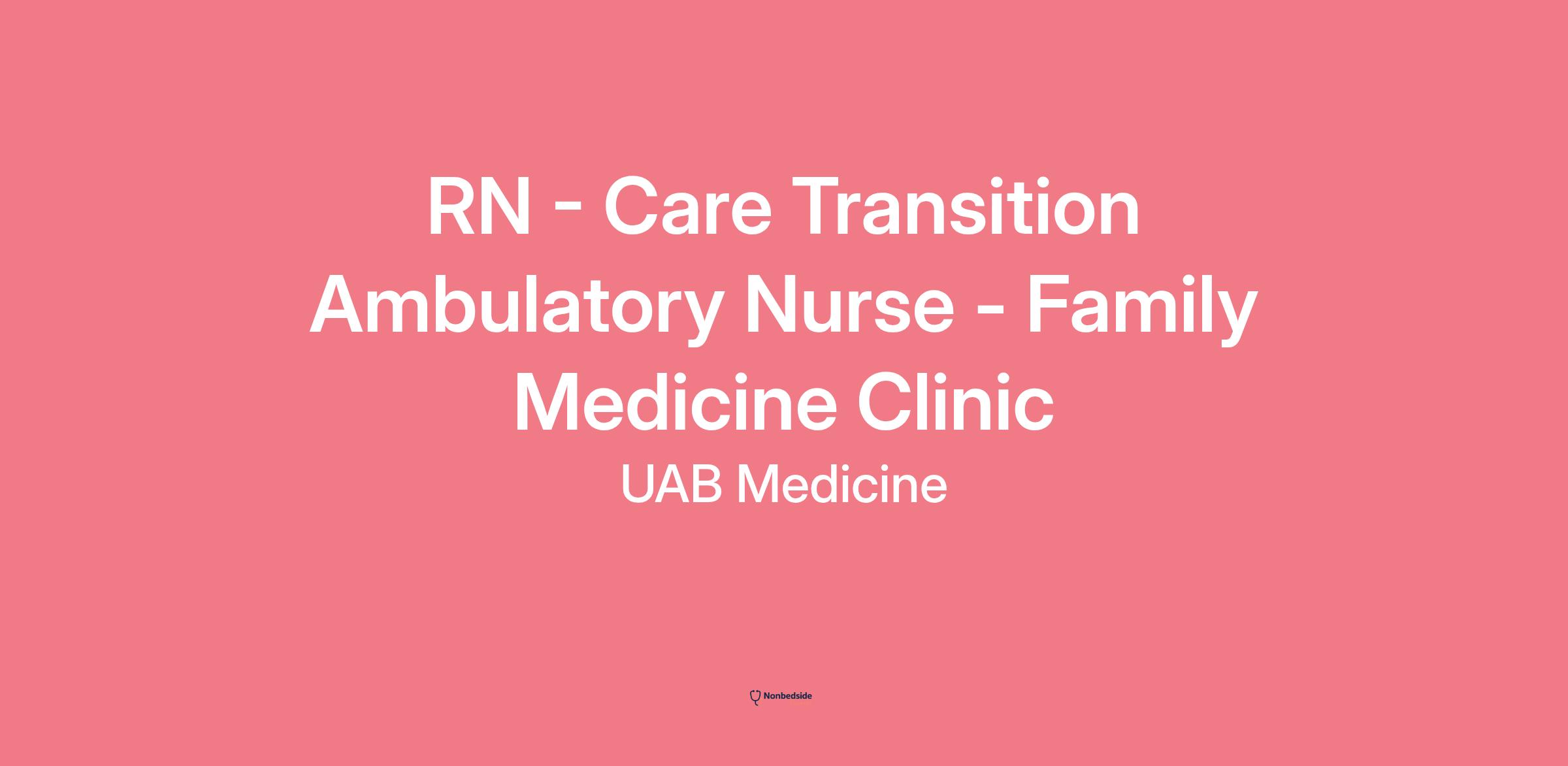 RN - Care Transition Ambulatory Nurse - Family Medicine Clinic The RN-Care Transition is responsible for provision and management of patient care in a clinical area for specific age and patient populations. The RN-Care Transition delivers care to patients utilizing the nursing process of assessment, planning, intervention, implementation, and evaluation; and effectively interacts with patient, significant others, and other health team members while maintaining standards of professional nursing.