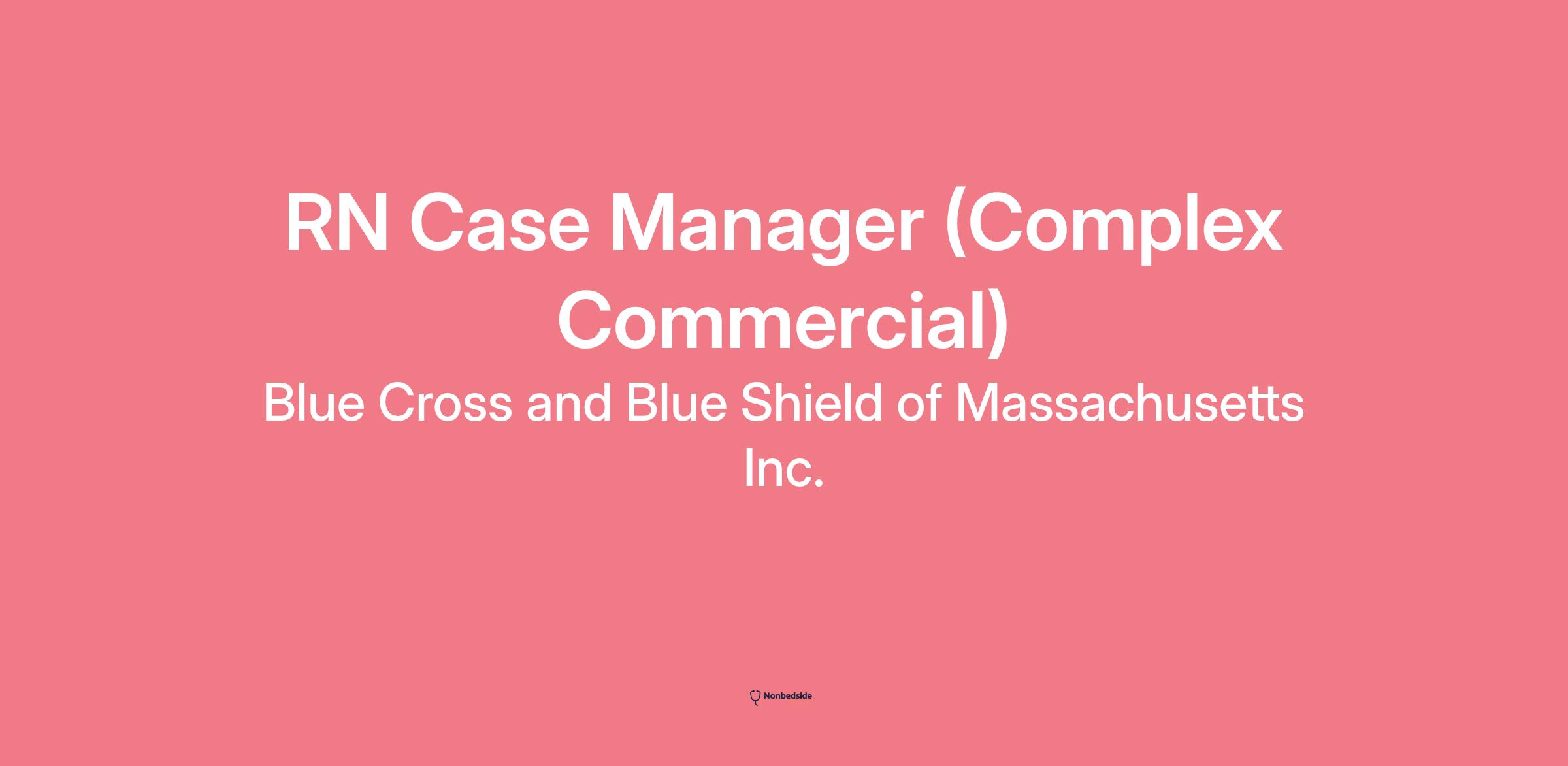 RN Case Manager (Complex Commercial) page is loaded## RN Case Manager (Complex Commercial)locations: Hinghamtime type: Full timeposted on: Posted 3 Days Agojob requisition id: R08025## **The Role**The RN Case Manager is responsible for facilitating care for members and families of members who may have rising health risks or complex healthcare needs, to promote optimal health.This position is self-directed and works independently and collaboratively to facilitate care based on the principles of care management. Facilitation is focused on assessing needs, identifying health care disparities, social determinants of health, and any barriers to care.**The Team**The RN Case Manager is part of a highly dedicated and motivated team of professionals, including medical and behavioral health care managers, dietitians, pharmacists, clinicians, medical directors and more, who collaborate to facilitate care.***This role is eligible for the Resident, Mobile, and eWorker personas. This position can be fully remote with an expectation to work in our Hingham, MA office 1x/month.*****Key Responsibilities:*** Engage members in appropriate plans of care, coordinate care and services as appropriate, communicate effectively and provide members with education and resources as needed. Promote member compliance with treatment plan, encourage shared decision-making, and set appropriate goals to promote optimal member outcomes.* Interpret and apply case management criteria, processes, policies, and regulatory standards to create, follow and appropriately document comprehensive care management plans.* Review medication list and educate members with complex pharmacy needs, and counsel on side effects and mitigation strategies for specific treatment protocols.* Successfully connect, engage, and maintain member engagement to support seamless care transitions and optimized health outcomes.* Interact with treatment providers, PCPs, physicians, therapists, and facilities as needed to gather clinical information to support the plan of care.* Monitor clinical quality concerns, make referrals appropriately, identify and escalate quality of care issues.* Understand member insurance products and benefits, as well as regulatory and NCQA requirements.**Key Qualifications:*** Ability to identify and document member-driven, specific, measurable activities that address actionable behaviors and goals.* Self-directed, independent, adaptive, flexible to change, and able to collaborate as a member of a team.* Proficient with multiple IT systems.* Demonstration of awareness, attitude, knowledge, and skills needed to work effectively with a culturally and demographically diverse population.**Education and Experience:*** 3-5 years relevant experience in a variety of appropriate clinical health care settings (Inpatient, outpatient, or differing levels of care).* Utilization Management experience, preferred.* Active licensure in Massachusetts is required.* Licensure in additional states a plus.* Note: Any restrictions against a license must be disclosed and reviewed.*#LI-HYBRID*## Minimum Education Requirements:High school degree or equivalent required unless otherwise noted above## LocationHingham## Time TypeFull timeHourly Range: $42.78 - $52.29 The job posting range is the lowest to highest salary we in good faith believe we would pay for this role at the time of this posting. We may ultimately pay more or less than the posted range, and the range may be modified in the future. An employee’s pay position within the salary range will be based on several factors including, but limited to, relevant education, qualifications, certifications, experience, skills, performance, shift, travel requirements, sales or revenue-based metrics, and business or organizational needs and affordability.This job is also eligible for variable pay.We offer comprehensive package of benefits including paid time off, medical/dental/vision insurance, 401(k), and a suite of well-being benefits to eligible employees.Note: No amount of pay is considered to be wages or compensation until such amount is earned, vested, and determinable. The amount and availability of any bonus, commission, or any other form of compensation that are allocable to a particular employee remains in the Company's sole discretion unless and until paid and may be modified at the Company’s sole discretion, consistent with the law.We understand that the and can prevent amazing candidates coming our way, so please don’t hesitate to apply. We’d love to hear from you. You might be just what we need for this role or possibly another one at Blue Cross Blue Shield of MA. The more voices we have represented and amplified in our business, the more we will all thrive, contribute, and be brilliant. We encourage you to bring us your true colors, , your perspectives, and your experiences. It’s in our differences that we will remain relentless in our pursuit to transform healthcare for ALL.As an employer, we are committed to investing in your development and providing the necessary resources to enable your success. Learn how we are dedicated to creating an inclusive and rewarding workplace that promotes excellence and provides opportunities for employees to forge their unique career path by visiting our page. If this sounds like something you’d like to be a part of, we’d love to hear from you. You can also join our to stay “in the know” on all things Blue.At Blue Cross Blue Shield of Massachusetts, we believe in wellness and that work/life balance is a key part of associate wellbeing. For more information on how we work and support that work/life balance visit our "" Page.locations: Hinghamtime type: Full timeposted on: Posted 4 Days AgoVoted as the highest in member satisfaction among Massachusetts commercial health plans by JD Power, Blue Cross Blue Shield of Massachusetts is a community-focused, tax-paying, not-for-profit health plan headquartered in Boston. We have been a market leader 