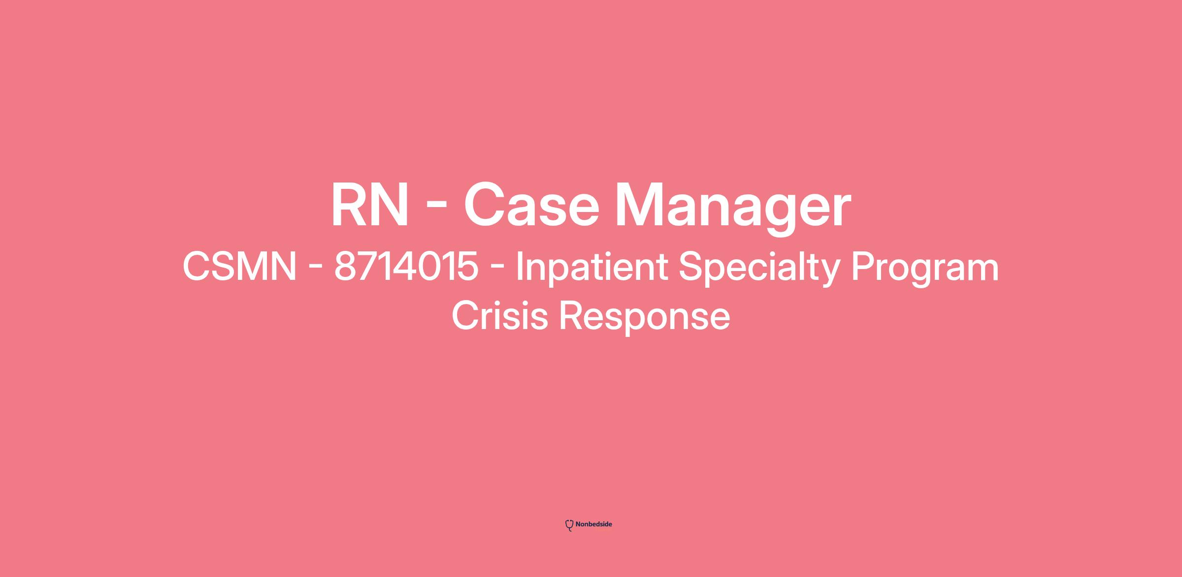 Client Name CSMN - 8714015 - Inpatient Specialty Program Crisis Response Job Type Travel Offering Nursing Profession RN Specialty Case Manager Job ID 15520009 Weekly Pay $2082.5