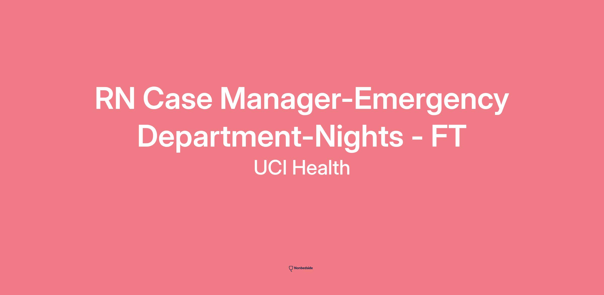 RN Case Manager-Emergency Department-Nights - FT UCI Health is seeking a RN Case Manager-Emergency Department-Nights - FT. The incumbent is responsible for a high level assessment and reassessment process for the patient/family to set priorities, plan, organize, and implement care that is goal-directed toward self-care outcomes.