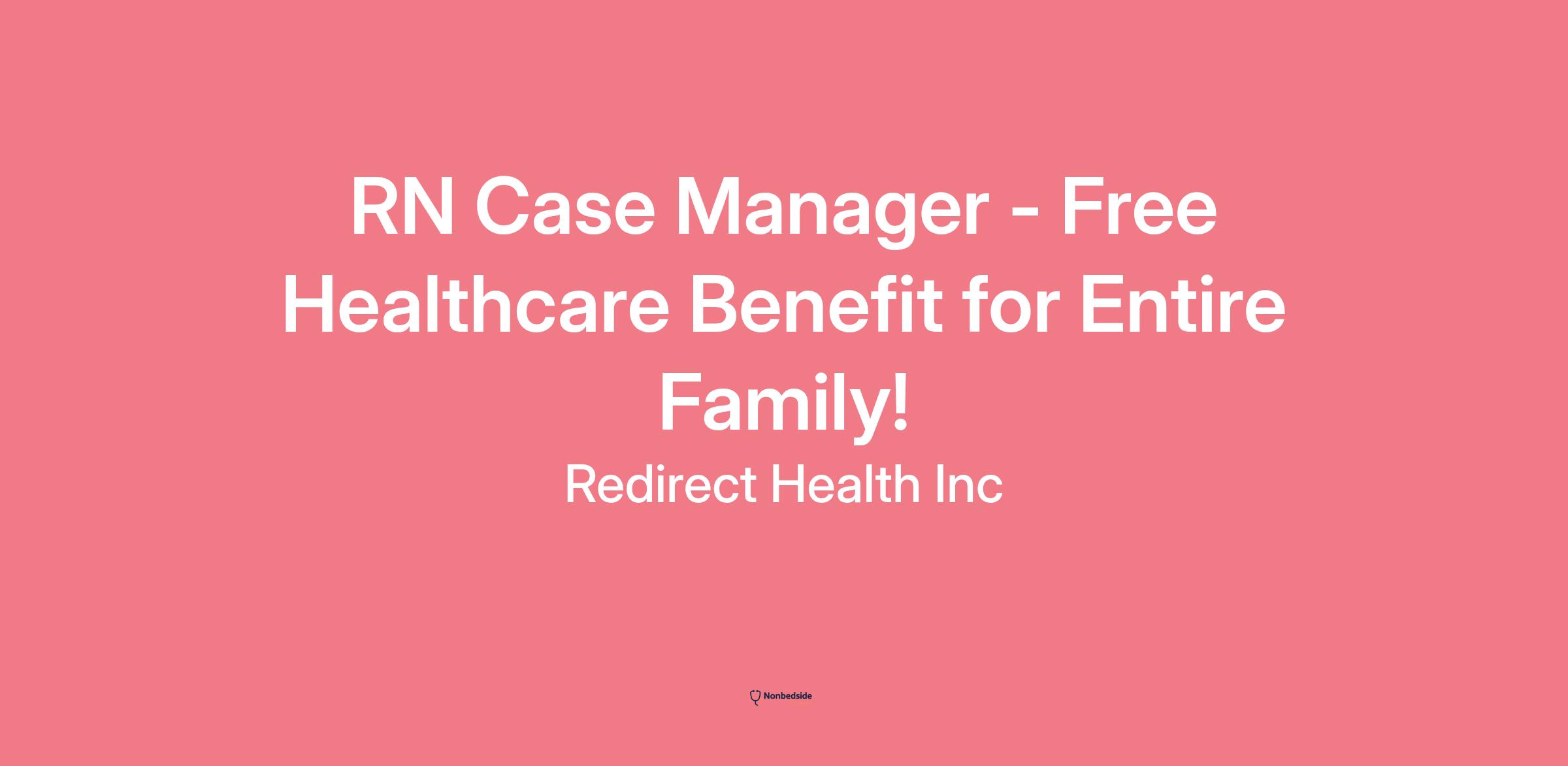 RN Case Manager - Free Healthcare Benefit for Entire Family! At Redirect Health, we’re on a mission to make healthcare accessible and affordable for everyone. We are currently accepting applications for RN, Case Manager roles.