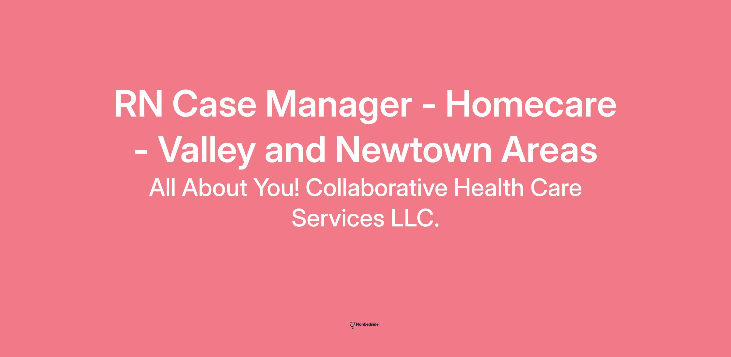 AllAbout You Collaborative Health Care Services, LLC is growing! We are seeking a Full Time RN Case Manager to join our team for the Newtown area and Valley/Shelton area, this included the surrounding towns. The ideal candidate will have home care experience and Homecare Homebase (HCHB) experience. You must be a Licensed RN to be considered for this position.