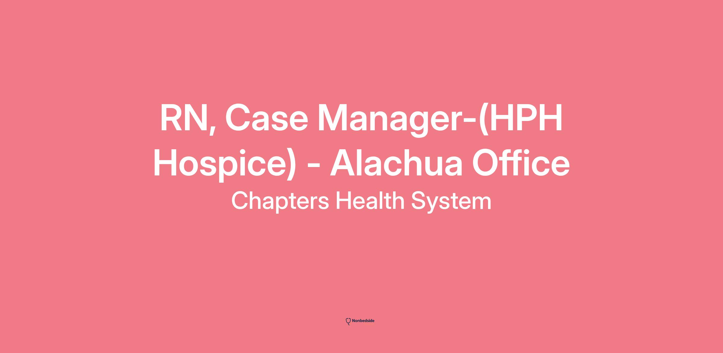 RN, Care Coordinator - HPH - Alachua Office page is loaded## RN, Care Coordinator - HPH - Alachua Officelocations: Alachua, FLtime type: Full timeposted on: Posted Todayjob requisition id: R259969**It’s inspiring to work with a company where people truly BELIEVE in what they’re doing!****When you become part of the Chapters Health Team, you’ll realize it’s more than a job. It’s a mission. We’re committed to providing outstanding patient care and a high level of customer service in our communities every day. Our employees make all the difference in our success!**Job Profile Summary Role: The RN, Case Manager is responsible for assessing and identifying patient/family needs, utilizing the nursing process, coordinating the Plan of Care with the Interdisciplinary Team (IDT), and providing clinical, palliative and supportive care to the patient/family unit in order to keep the participant in their home environment as long as possible.Job DescriptionQualifications: • Current license as RN in the state where the employee will be working • Minimum of one (1) year nursing experience; hospice or hospital experience preferred • Previous experience working with an EMR/EHR (Electronic Medical/Health Record) system • Mobile Driver - Valid driver’s license and automobile insurance per Company policy • Reliable transportation to meet visit schedule • Ability to use equipment with visual and auditory mechanisms • Ability to effectively communicate in English (verbal and written) • Ability to visit Participant in their homes to assessments • Ability to perform the essential functions and physical requirements (including, but not limited to: lifting patients and/or equipment, bending, pushing/pulling, kneeling) of the job with or without reasonable accommodation• Active BLS for healthcare professionals from the American Heart Association or Red Cross.Some locations may require:* Provides reassurance on the phone to patients and families. Assists in finding solutions to their questions and/or recognizes the need for an in person visit. Coordinates in person visit when needed/or requested.* Utilizes appropriate support/expert resources or personnel to resolve complex or difficult situations.* Documents patient/family contact information in the EMR and communicates with the Interdisciplinary Team (IDT).* Completes initial and semi-annual assessment for all Company services including, but not limited to: + Explains services to patients/families and addresses questions regarding patient needs, fears, physical limitations, while putting the patient/family at ease; presents services in an empathetic and compassionate manner + Provides information to Physicians and other IDT members and initiates Plan of Care to address patient’s immediate needs + Initiates skilled nursing interventions to enhance prevention, prevent complications, alleviate symptoms and maximize physical and emotional comfort + Obtains Physician orders + Completes documentation per Company policy* Acts as the Company representative at assigned facilities while facilitating referrals to all service lines; works closely with referring hospitals, physicians, facilities, patients, families, and the general public.* Communicates frequently with other members of the IDT.* Provides all necessary clinical communication timely using SBAR.* Discusses any potential needs with after-hours staff.* Develops strong relationships with case managers, physicians, etc. at facilities.Competencies: • Satisfactorily complete competency requirements for this position. Responsibilities of all employees: • Represent the Company professionally at all times through care delivered and/or services provided to all clients. • Comply with all State, federal and local government regulations, maintaining a strong position against fraud and abuse. • Comply with Company policies, procedures and standard practices. • Observe the Company's health, safety and security practices. • Maintain the confidentiality of patients, families, colleagues and other sensitive situations within the Company. • Use resources in a fiscally responsible manner. • Promote the Company through participation in community and professional organizations. • Participate proactively in improving performance at the organizational, departmental and individual levels. • Improve own professional knowledge and skill level. • Advance electronic media skills. • Support Company research and educational activities. • Share expertise with co-workers both formally and informally. • Participate in Quality Assessment and Performance Improvement activities as appropriate for the position. Job Responsibilities: • Provides and manages direct care to patients and families as part of Interdisciplinary Team (IDT), incorporating psychosocial, spiritual, cultural, physical and biological components, and appropriate nursing intervention and follow-up. • Coordinates the Plan of Care, ensuring that an individualized Plan of Care is developed that accurately reflects the patient’s evolving needs. • Educates patient, family, caregivers and other health professionals about disease process and decline, prevention, palliative interventions, care giving, dying process and safety practices.- Participant visit frequency dependent on risk score/needs to be determined- Home visits to assess home safety, medication compliance, nutritional compliance, DME compliance- ability to live safely in the community. • Reports changes in the patient’s condition to appropriate members of the IDT or other health professionals. • Participates with the IDT to evaluate hospice referrals/admissions for level of care appropriateness.- Attends daily IDT collaboration meetings • Presents concise and pertinent oral and written reports to IDT; respects and encourages input from all disciplines. • Communicates accurately and completely to physicians, staff members, patients, families, and 