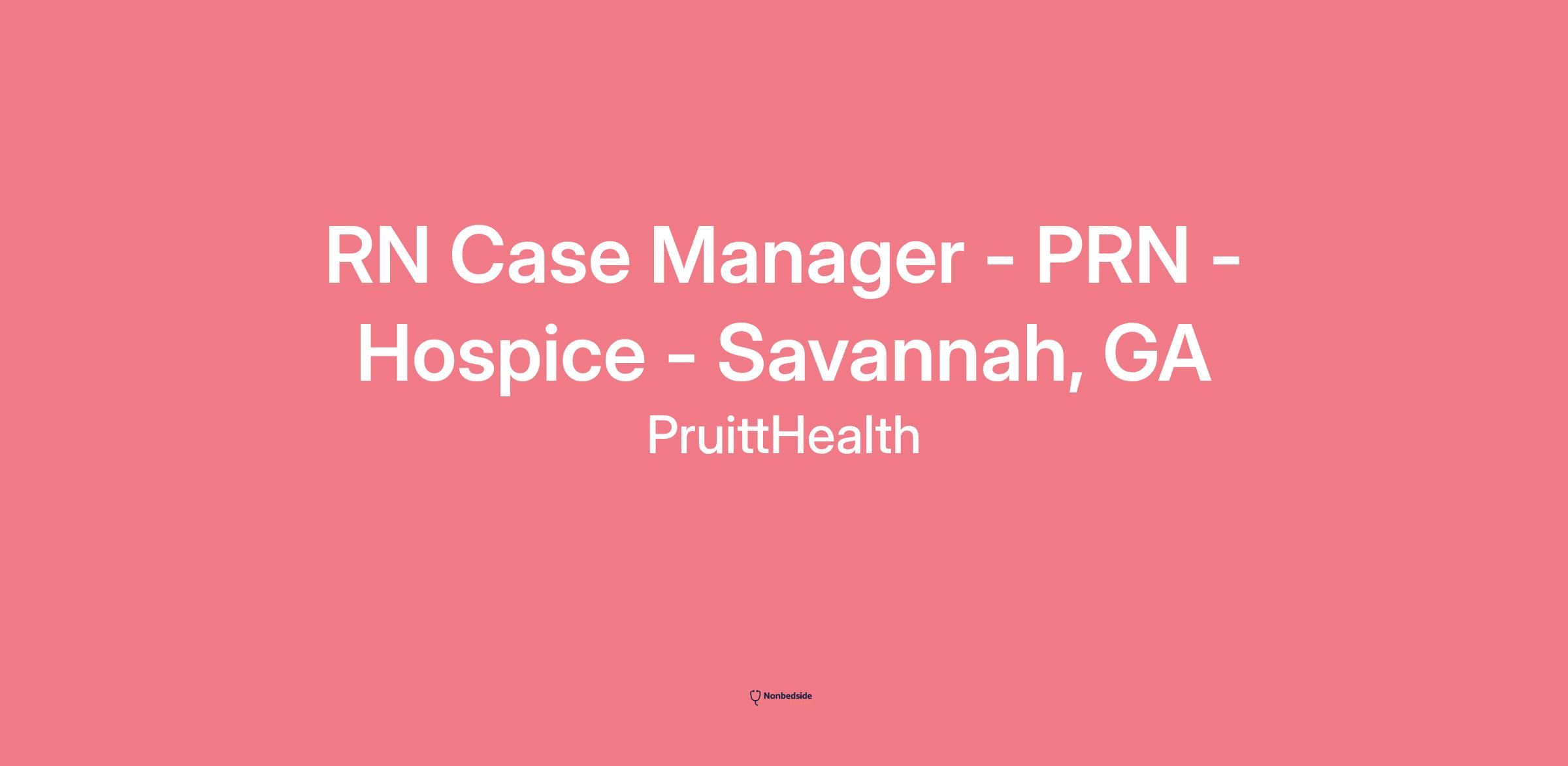 RN Case Manager - PRN - Hospice - Savannah, GA Category : Hospice Care Location/City : GA - Savannah Id : 18911At PruittHealth and PruittHealth Hospice, Committed to Caring isn't simply a tagline, it's the way we do business and it's ingrained in our culture.At PruittHealth, we don't hire employees ? we welcome _partners!_Since its inception in 1969, PruittHealth has been a family-owned innovative organization committed to providing exceptional care across a wide spectrum of services including:skilled nursing care, assisted & independent living, home health care, end-of-life hospice care, rehabilitation, pharmacy/infusion services and more.Today, the organization is the 14th largest skilled nursing provider in the United States, spans across the Southeast, touches 170 communities, cares for 24,000 patients daily, and is driven by 16,000 passionate partners. Title: RN Case Manager - PRN Location: Savannah, GA Job Description: The RN Hospice Case Manager provides the primary nursing care for hospice patients, regardless of the setting.The Case Manager works closely with the attending physician and other team members to develop appropriate pain and symptom management.The Case Manager is to assure that patient coverage is compliant with all Federal, State and Local regulations. Job Requirements: Competes nursing assessmentsProvides assistance with patient visits and admission in various locationsFacilitates the transition of the patient and family into the hospice program.Assumes all on-call responsibilities as assigned.Responsible for the management of the patients' symptoms and plan of care. Qualifications: Must be a graduate from an Accredited School of Nursing and have a current license to practice as a Registered Nurse in practicing state.Have previous hospice experience as a Case Manager.Experience in ICU/Critical care/Oncology is preferred.Must have the ability to relate professionally and positively and work cooperatively with patients, families, and other employees at all levels._Please reference the job title and send resume and salary requirements resume to_ 18911-MH1184@apply.maxhire.netPruittHealth is an Equal Employment Opportunity employer and all qualified applicants will receive consideration without regard to race, color, religion, sex, national origin, disability or veteran status...