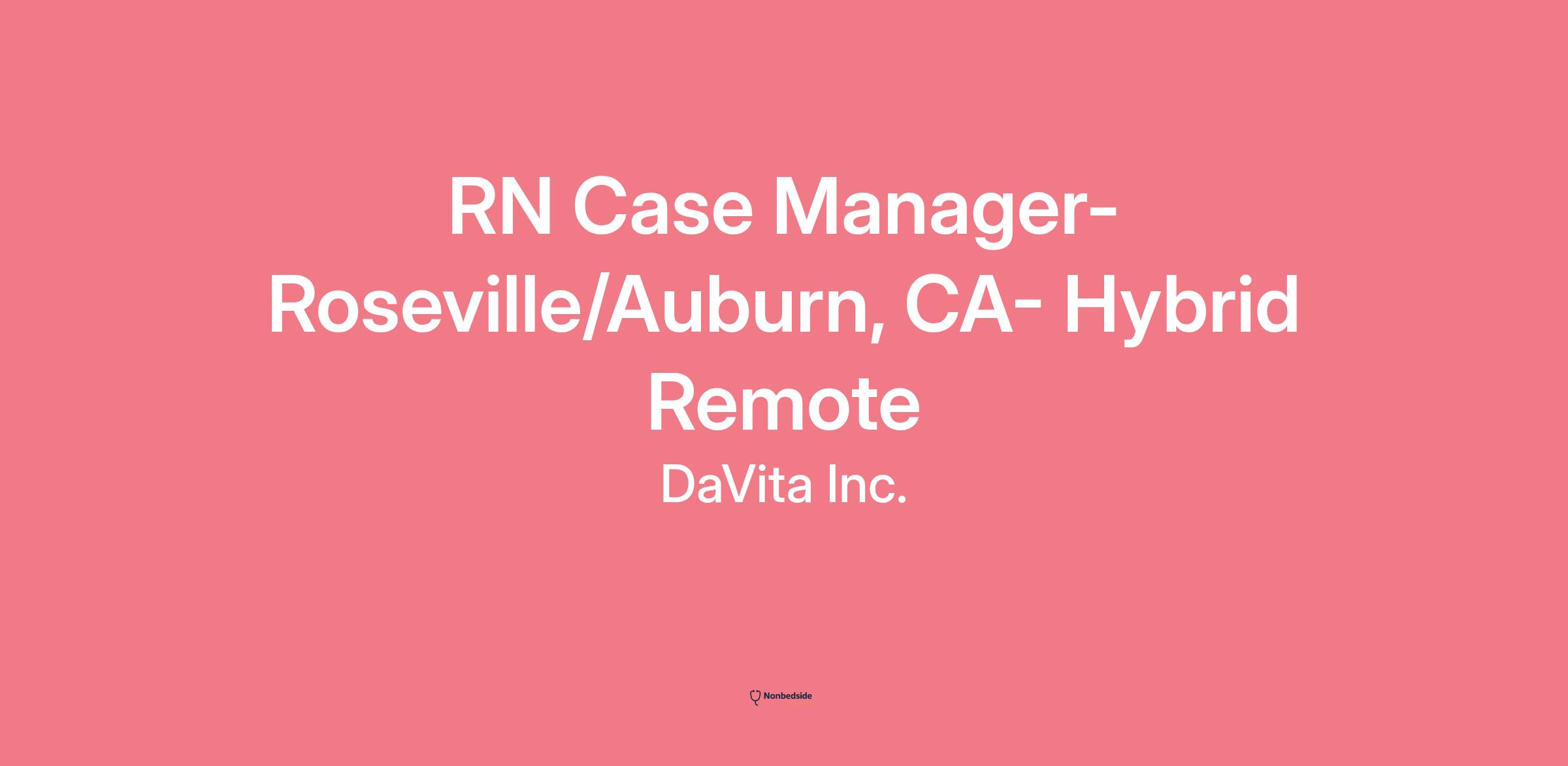 **Posting Date**09/16/20251836 Sierra Gardens DrSuite 150, Roseville, California, 95661-2943, United States of AmericaDaVita Integrated Kidney Care (IKC) is looking for a Full-Time RN Case Manager (RN) to join us in **Roseville/Auburn, CA region. \* Must live locally\***As a DaVita Integrated Kidney Care **Registered Nurse (RN) Case Manager** you will support some of our most complex patients, assisting them in navigating a challenging healthcare system. Through medical record review and consultation, you will identify the medical, social, emotional, and financial needs of your patients with CKD/ ESKD and implement appropriate interventions. You’ll work autonomously and in collaboration with all members of the healthcare team to coordinate and facilitate quality, consistent, cost-effective care. **Position Details:*** **Location: Hybrid-Remote. Work from home (telehealth) and travel within an assigned geography for in-person visits (dialysis clinics and nephrology practices).*** **Monday- Friday schedule** with the ability to accommodate patient and nephrology partner’s availability. **Must be flexible.*** **Full-time position.*** Quickly build empathetic relationships with patients and families.* Coordinate care for patients’ care including care transitions, management of complex/at risk patients, managing ongoing needs and establishing a treatment plan in partnership with the care team.* Identify and address social determinants of health including medical, emotional, education, community, and financial concerns.* Coordinate for streamlined/effective transition of care when needed.* Assesses patients and work to identify unreported medical conditions or changes that may lead to adverse outcomes.**Requirements:*** Passion for delivering care to patients with complex, chronic illnesses.* You are flexible and are willing to pivot quickly on priorities.* Current RN License is required, BSN preferred.* Minimum of 2 years RN experience required with healthcare performance coaching.* Current Cardiopulmonary Resuscitation (CPR) or Basic Life Support (BLS) certification.* Current driver’s license and willingness to travel within an assigned territory.* Intermediate computer skills and proficiency in MS Word, Excel & Outlook required.* Home office with internet connectivity at a minimum of 1MB upload and 1MB download speed required.**Preferred Qualifications:*** 2+ years of Case Management or Chronic Care Management* 1+ years of utilization management experience* Spanish-speaking preferred in some marketsDaVita IKC (Integrated Kidney Care) is comprised of an innovative team who is committed to improving patient outcomes and improving quality of life. Come work with a team of passionate professionals to transform kidney care through a value-based, person-centered, comprehensive approach to kidney care.We provide comprehensive care and complex chronic condition management to patients nationwide, whether they are in the early stages of , , seeking a or receiving life-sustaining dialysis.27,000+ patients receiving IKC services every month20 years of Integrated Kidney Care ExperienceWe’re on a mission to revolutionize kidney care, with a vision of making integrated care the standard of care for all renal patients. To help us achieve our vision, we’re investing extensively in developing both our model of care and our team. When you join DaVita IKC, you're joining a compassionate team committed to quality patient care. Through our commitment to training, growth and quality we consistently achieve superior clinical outcomes while giving teammates the opportunity to excel in an award-winning environment that enables them to thrive both professionally and personally.**What We’ll Provide:**More than just pay, our DaVita Rewards package connects teammates to what matters most. Teammates are eligible to begin receiving benefits on the first day of the month following or coinciding with one month of continuous employment. Below are some of our benefit offerings.* **Comprehensive benefits:** Medical, dental, vision, 401(k) match, paid time off, PTO cash out* **Support for you and your family:** Family resources, EAP counseling sessions, access Headspace, backup child and elder care, maternity/paternity leave and more* **Professional development programs:** DaVita offers a variety of programs to help strong performers grow within their career and also offers on-demand virtual leadership and development courses through DaVita’s online training platform StarLearning.#LI-BB3At DaVita, we strive to be a community first and a company second. We want all teammates to experience DaVita as "a place where I belong." Our goal is to embed belonging into everything we do in our Village, so that it becomes part of who we are. We are proud to be an equal opportunity workplace and comply with state and federal affirmative action requirements. Individuals are recruited, hired, assigned and promoted without regard to race, national origin, religion, age, color, sex, sexual orientation, gender identity, disability, protected veteran status, or any other protected characteristic.This position will be open for a minimum of three days.The Salary Range for the role is $87,400 - $114,000 per year.For location-specific minimum wage details, see the following link:Compensation for the role will depend on a number of factors, including a candidate’s qualifications, skills, competencies and experience. DaVita offers a competitive total rewards package, which includes a 401k match, healthcare coverage and a broad range of other benefits. Learn more at **Colorado Residents: Please do not respond to any questions in this initial application that may seek age-identifying information such as age, date of birth, or dates of school attendance or graduation. You may also redact this information from any materials you submit during the application process. You will not be penalized for redacting or removing this information.**DaV