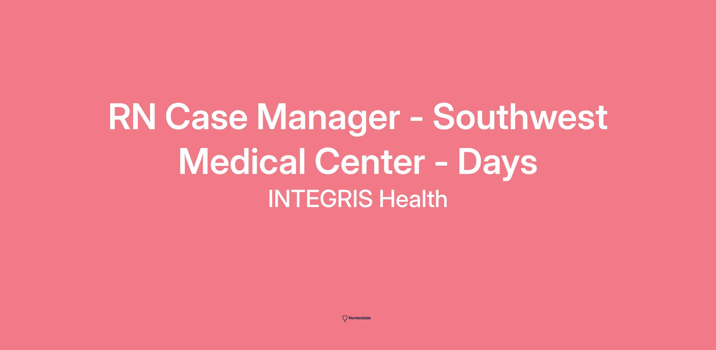 INTEGRIS Health Southwest Medical Center, Oklahoma's largest not‑for‑profit health system, offers an exciting opportunity for an RN Case Manager to work full‑time, days in Oklahoma City.