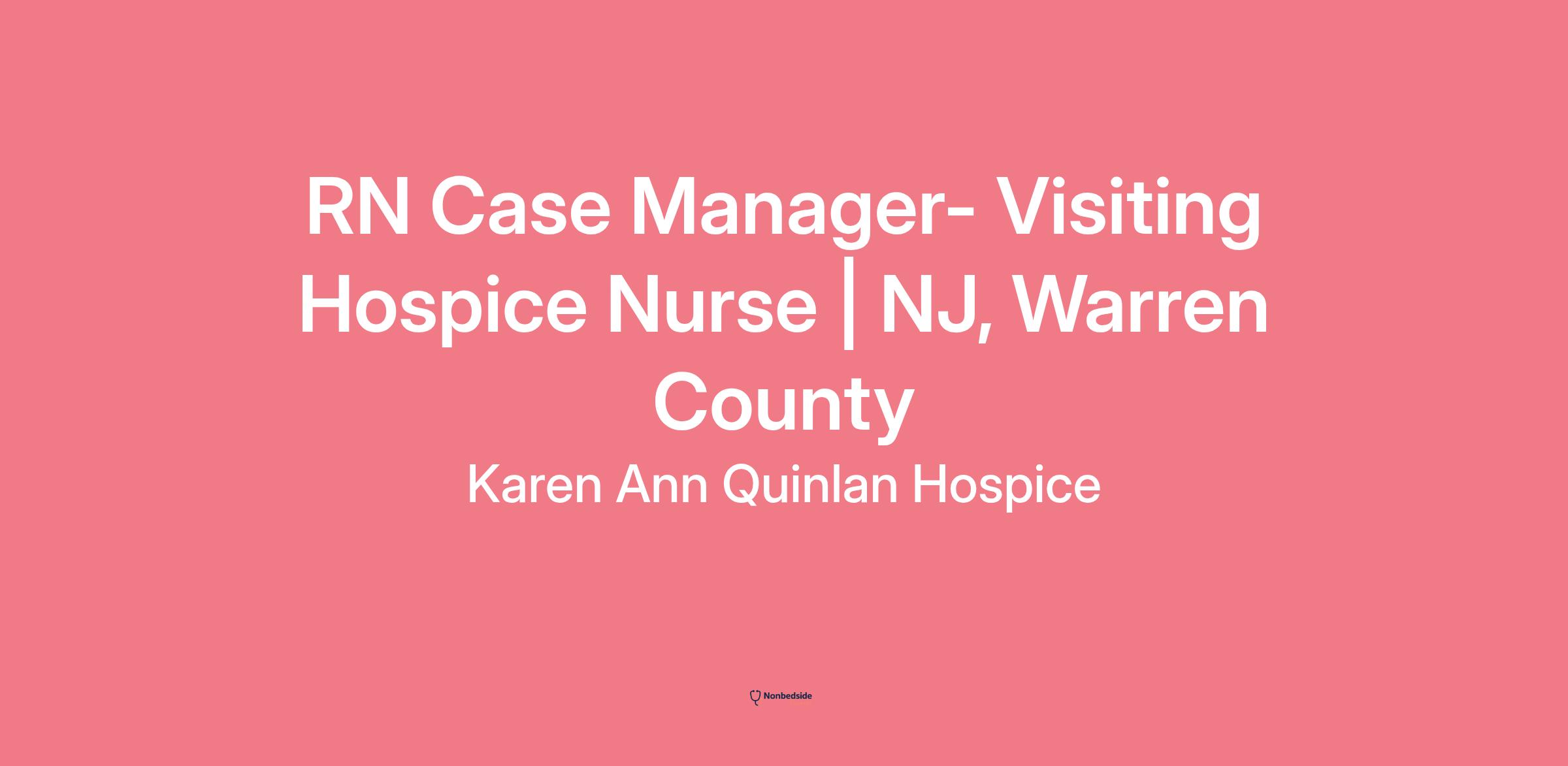 RN Case Manager- Visiting Hospice Nurse | NJ, Warren County We are an equal employment opportunity employer. All qualified applicants will receive consideration for employment without regard to race, color, religion, sex, national origin, disability status, protected veteran status or any other characteristic protected by law.