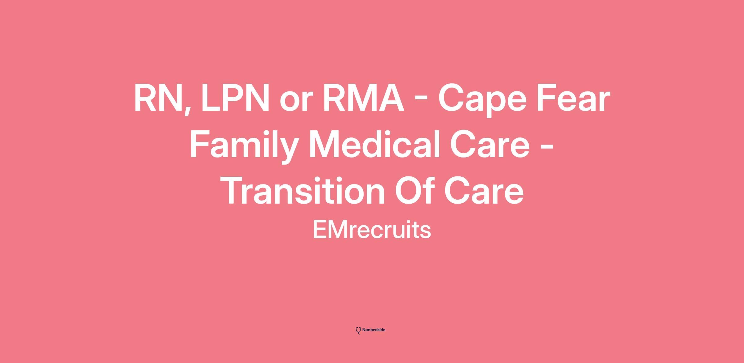 Cape Fear Family Medical Care is searching for a Transition of Care RMA / LPN / RN to join their team. We're an independent physician practice located in Fayetteville, North Carolina.