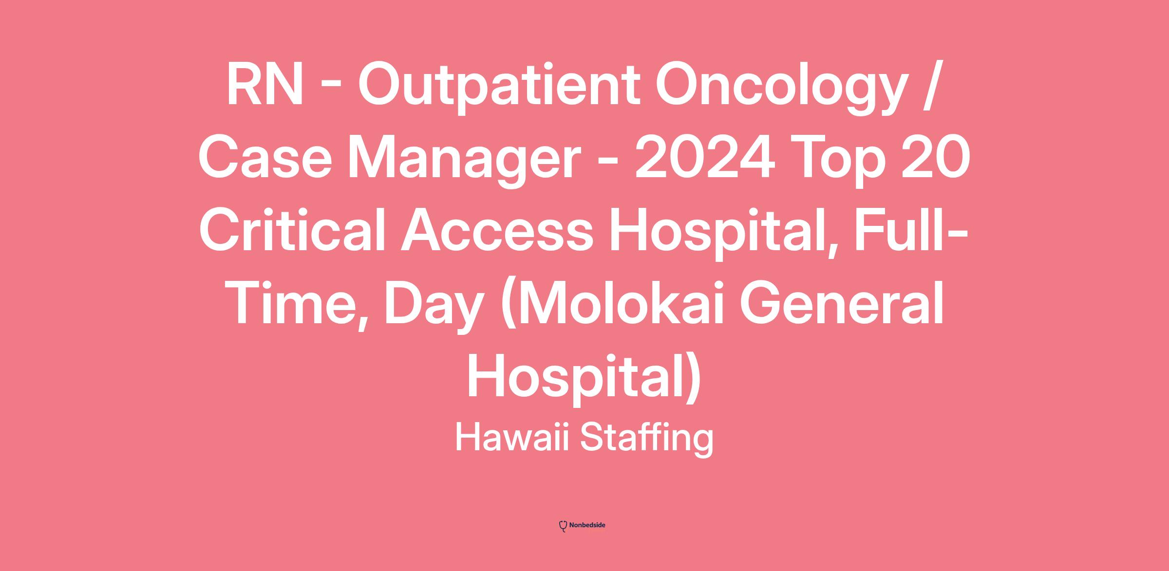 Molokai General Hospital is looking for a Full-Time Outpatient Oncology RN / Case Manager. Responsibilities include, but are not limited to, actively supporting and participating in patient care, health care education, case management, program development, community networking, and clinic cost management. Responsible to the Outpatient Clinic Manager. Actively supports and participates in patient care, health care education, case management program development, community networking, and clinic cost management. Essential functions include seeing, hearing, speaking, sitting, finger dexterity, lifting weight up to 50 pounds, pushing/pulling and carrying items. Occasional: standing, walking, stooping/bending, twisting body, and finger dexterity. Operates computer, printer, fax, and clinical equipment. Both inside and outside environmental conditions; noise and/or vibration; hazardous physical conditions; atmospheric conditions which affect the respiratory system or the skin.