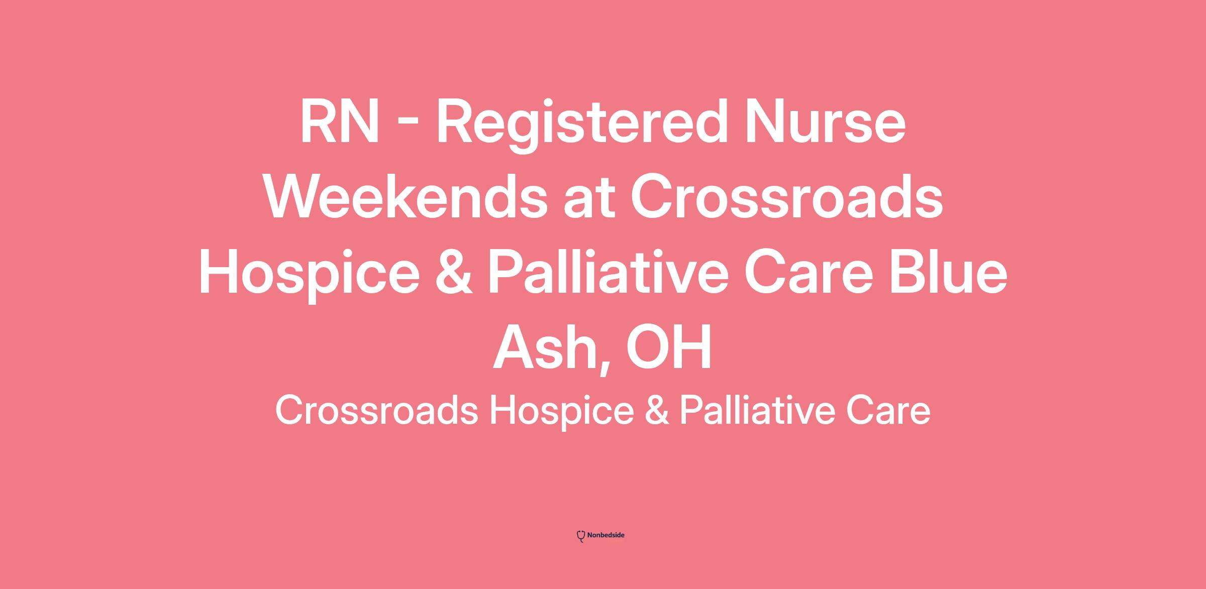 Overview RN - Registered Nurse Weekends job at Crossroads Hospice & Palliative Care. Blue Ash, OH.