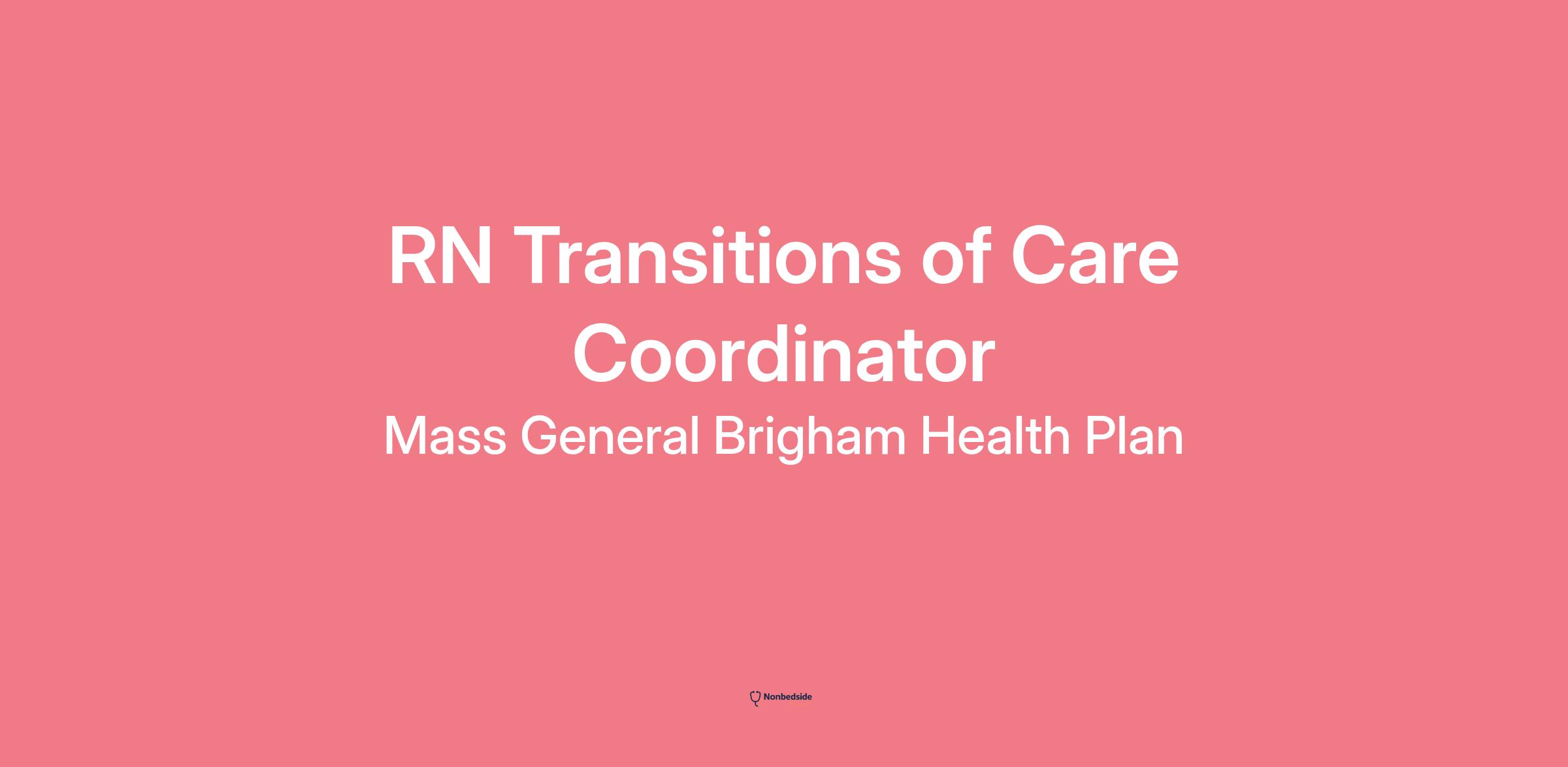 Overview The Opportunity. Mass General Brigham is hiring two Transitions of Care Coordinators to work as part of an interdisciplinary care team dedicated to supporting enrollees and their families in navigating the healthcare system through effective planning and coordination of care transitions. This role will primarily serve enrollees in the One Care and Senior Care Options (SCO) programs. The Transitions of Care Coordinator is a Registered Nurse who acts as the primary liaison for each enrollee throughout transitions between care settings. This role involves collaboration with the enrollee's Interdisciplinary Care Team (ICT) Lead to facilitate discharge planning to appropriate settings and oversee transition processes, engaging the ICT including the Long-Term Services Coordinator (LTSC) and Geriatric Support Services Coordinator (GSSC) as needed. The coordinator conducts assessments of post-discharge and post-transition needs, presents suitable options to enrollees and their caregivers, develops individualized care plans, and ensures thorough documentation of all assessment updates. This position is integral to reducing hospital readmissions, improving continuity of care, and providing essential support to enrollees and their families at critical points in their healthcare journey. This position requires a hybrid work model, including practice-based responsibilities, remote work, and facility or community visits as needed. The population of focus will primarily include enrollees residing in Essex, Middlesex, Suffolk, Norfolk, Plymouth, Bristol, Dukes, and Nantucket counties. This position's responsibilities and caseload may be adjusted based on enrollee enrollment trends.