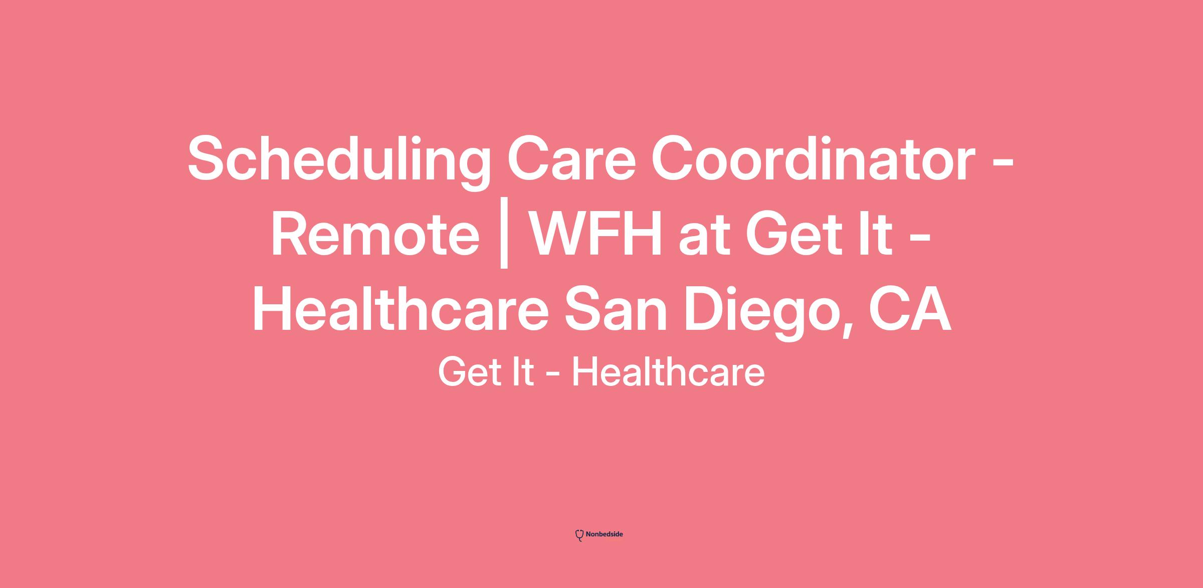 Overview Scheduling Care Coordinator - Remote | Get It - Healthcare. San Diego, CA. In this role, you'll collaborate with a team to create efficient scheduling plans and coordinate care for clients based on recommendations from our clinical team. Reporting to the Scheduling Care Supervisor and Regional Scheduling Manager, you will use your organizational skills to help implement comprehensive care solutions for each client. We are a rapidly growing healthcare organization focused on providing effective, personalized treatments for children with neurodevelopmental differences. Our mission is to deliver life-changing care, one child, one family, and one community at a time. We believe in unlocking the full potential of every child, and each team member plays a key role in making this vision a reality. We are committed to fostering a culture that celebrates diversity, inclusion, and respect. We value every individual\'s contributions and create an environment where everyone\'s voice is heard. We are an equal opportunity employer and believe in treating all team members with dignity and fairness.