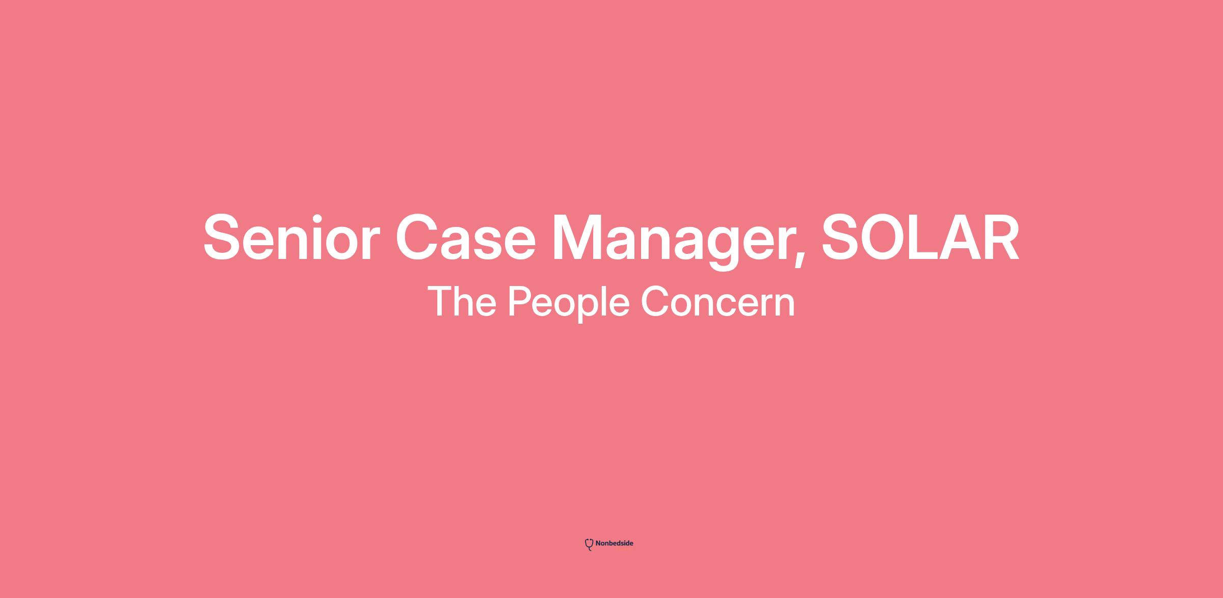 Overview Senior Case Manager, SOLAR at The People Concern. DHS funded Recuperative Care Program serving individuals experiencing homelessness with acute medical issues. Reports to: Senior Program Manager. Program: 1006-SOLAR. Department: Interim Housing. Location: South LA Recuperative Care Center (SOLAR) - 4200 East Compton Blvd., Compton CA 90221. Setting: 100% Onsite. Schedule: Tuesday - Saturday, 8:00am - 4:30pm. Status: Full-time/Non-Exempt/Non-Management.