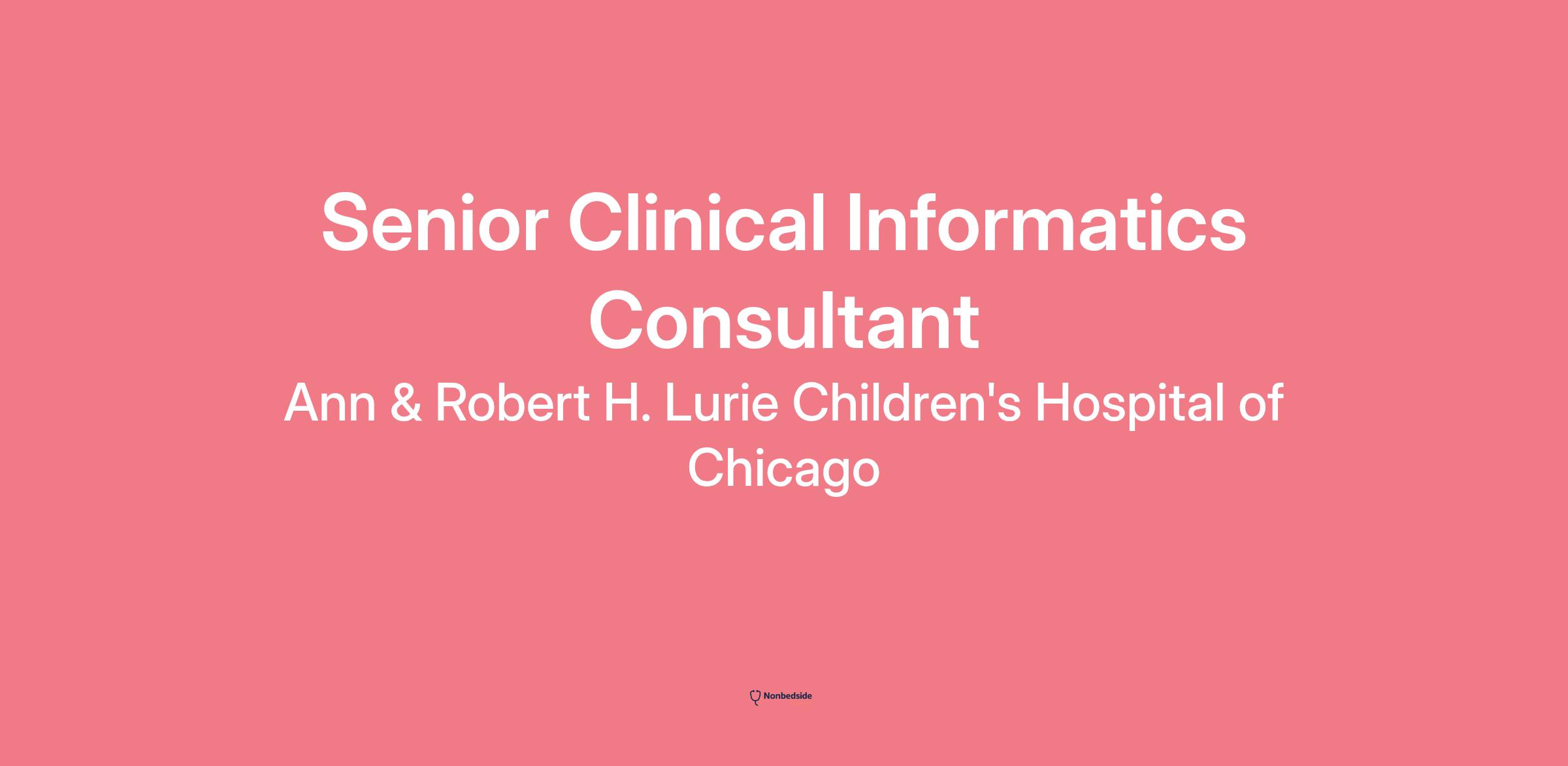 The Senior Clinical Informatics Consultant reflects the mission, vision, and values of Ann & Robert H. Lurie Children's Hospital of Chicago, adheres to its Code of Ethics and Corporate Compliance Program, and complies with all relevant policies, procedures, guidelines, and regulatory and accreditation standards.