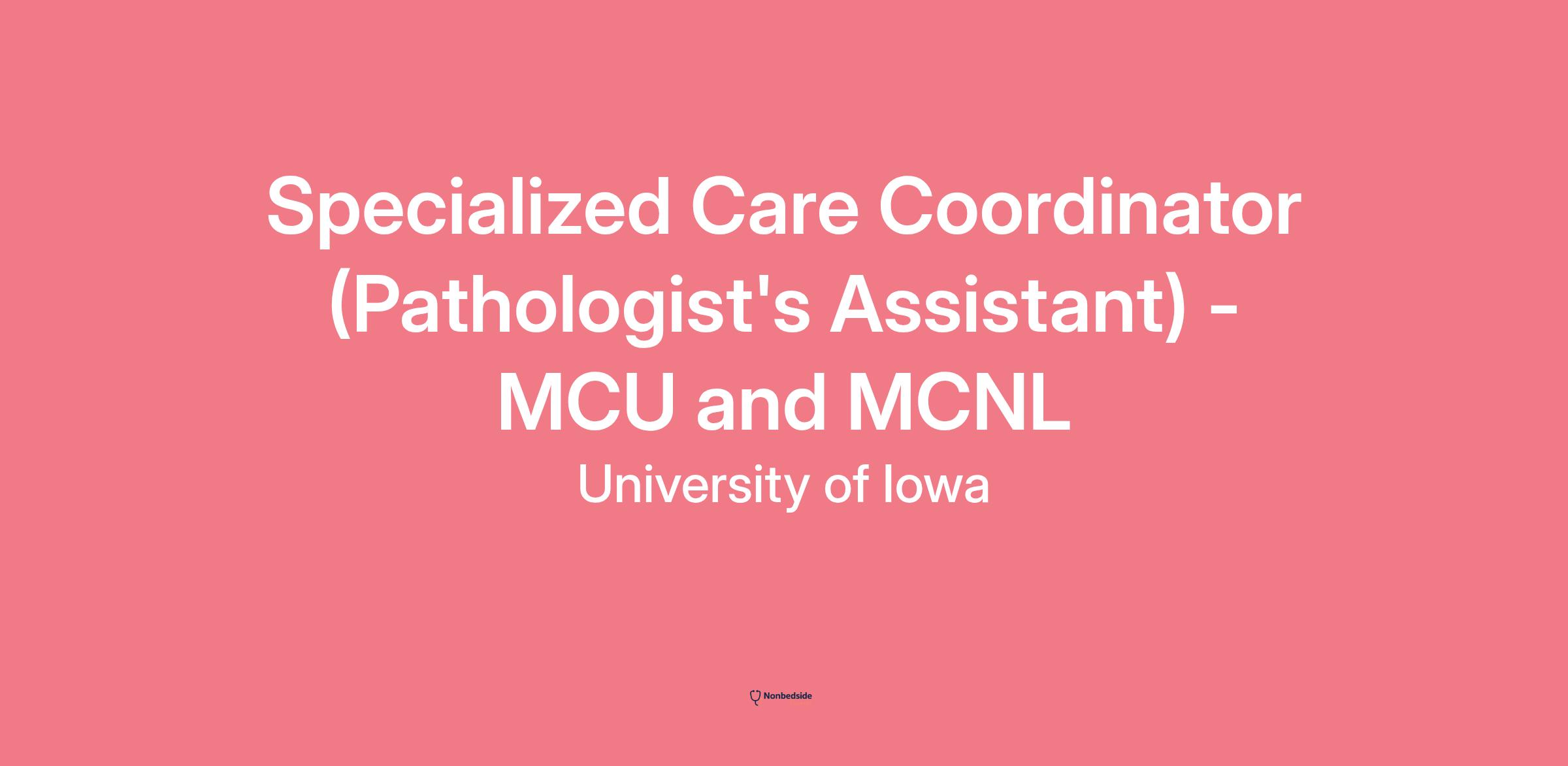 The Department of Pathology is seeking a Specialized Care Coordinator (working title: Pathologists' Assistant) to act as a primary provider of laboratory services in the designated service areas requiring specialized knowledge, practice, expertise, and high visibility and interaction. To serve as a practitioner, educator/role model for fellows, residents, externs, and staff members. It is the role of the Pathologists' Assistant to continuously interact and consult with the Laboratory Medical Director, Surgical Pathology Lab Supervisor, Assistant Lab Manager, and designee. The area of specialized knowledge includes describing, dissecting, and submitting samples of human surgical specimens and, as directed, to assume other responsibilities including administering, supervising, and teaching. Tasks are performed at multiple UIHC Surgical Pathology locations (MCU and MCNL). This position is 100% time, Monday Friday, first shift, 0830-1700.