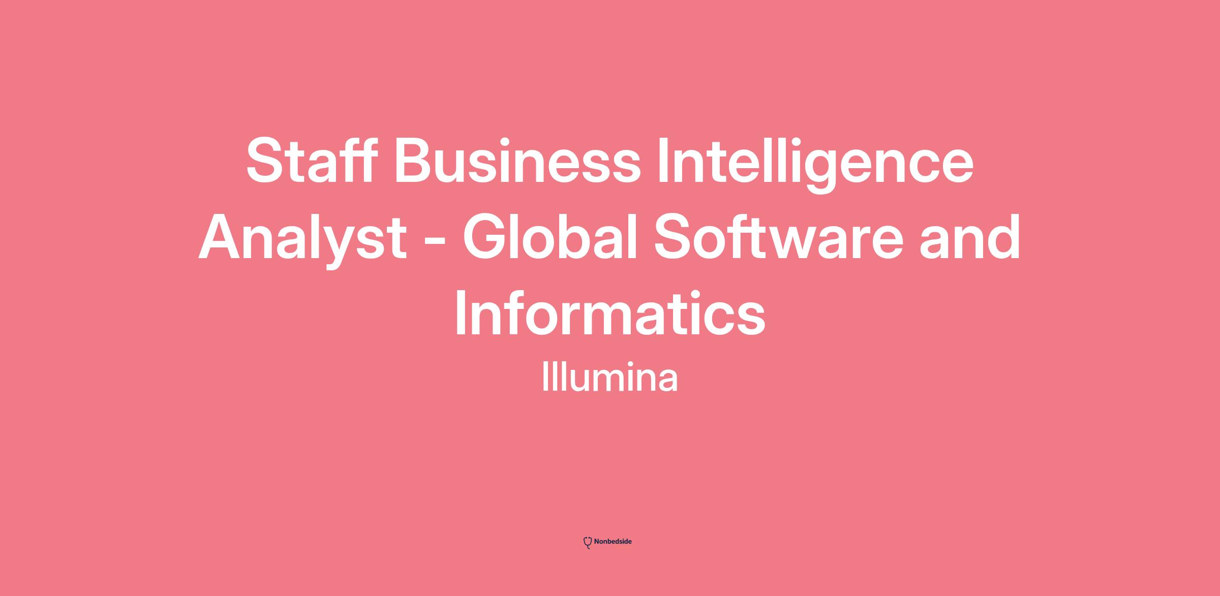 Staff Business Intelligence Analyst - Global Software and Informatics page is loaded## Staff Business Intelligence Analyst - Global Software and Informaticslocations: US - California - San Diegotime type: Full timeposted on: Posted Todayjob requisition id: 41104-JOB## At Illumina, we are expanding access to genomic technology to realize health equity for billions of people around the world. Our efforts enable life-changing discoveries that are transforming human health through the early detection and diagnosis of diseases and new treatment options for patients.## Working at Illumina means being part of something bigger than yourself. Every person, in every role, has the opportunity to make a difference. Surrounded by extraordinary people, inspiring leaders, and world changing projects, you will do more and become more than you ever thought possible.## The Staff Business Intelligence Analyst is responsible for analyzing product, commercial and research data to help drive strategic decision making across R&D, product, and marketing for Illumina’s software and informatics portfolio.**Responsibilities:*** Design and develop business intelligence solutions (dashboards, reports, data models) using tools like Tableau and Salesforce.* Analyze software product usage data to identify trends, user behavior, and opportunities for product improvement.* Collaborate with product, R&D, and marketing teams to define KPIs and track performance metrics.* Extract, clean, and validate data from various sources (e.g., Salesforce, SAP, Zuora, product databases, cloud platforms).* Take initiative to develop and implement new processes to strengthen data accuracy and enhance efficiency.* Present insights and recommendations to stakeholders through compelling visualizations and storytelling.* Monitor data quality and integrity, ensuring consistency across systems and reports.* Perform other job duties as required/assigned.**Preferred Experience/Education:*** Minimum of 8 years of related experience with a bachelor's degree in computer science, data analytics, business, or related field; or 6 years and master's degree; or 3 years and PhD.* Proficiency in SQL, data visualization tools, and data modeling.* Strong understanding of software development lifecycles and SaaS metrics.* Experience with cloud data platforms (e.g., Snowflake, BigQuery, Redshift).* Excellent communication skills, both verbal and written, with the ability to translate complex data into clear business narratives.* Demonstrated ability to work with ambiguous requirements, adapt, and learn.* Must be a self-starter, with relentless curiosity and attention to detail.* Detail oriented, proactive, works independently, works well with others#LI-HYBRID### The estimated base salary range for the Staff Business Intelligence Analyst - Global Software and Informatics role based in the United States of America is: $138,800 - $208,200. Should the level or location of the role change during the hiring process, the applicable base pay range may be updated accordingly. Compensation decisions are dependent on several factors including, but not limited to, an individual’s qualifications, location where the role is to be performed, internal equity, and alignment with market data. Additionally, all employees are eligible for one of our variable cash programs (bonus or commission) and eligible roles may receive equity as part of the compensation package. We offer a wide range of benefits as innovative as our work, including access to genomics sequencing, family planning, health/dental/vision, retirement benefits, and paid time off.### We are a company deeply rooted in belonging, promoting an inclusive environment where employees feel valued and empowered to contribute to our mission. Built on a strong foundation, Illumina has always prioritized openness, collaboration, and seeking alternative perspectives to propel innovation in genomics. We are proud to confirm a zero-net gap in pay, regardless of gender, ethnicity, or race. We also have several Employee Resource Groups (ERG) that deliver career development experiences, increase cultural awareness, and offer opportunities to engage in social responsibility. We are proud to be an equal opportunity employer committed to providing employment opportunity regardless of sex, race, creed, color, gender, religion, marital status, domestic partner status, age, national origin or ancestry, physical or mental disability, medical condition, sexual orientation, pregnancy, military or veteran status, citizenship status, and genetic information. Illumina conducts background checks on applicants for whom a conditional offer of employment has been made. Qualified applicants with arrest or conviction records will be considered for employment in accordance with applicable local, state, and federal laws. Background check results may potentially result in the withdrawal of a conditional offer of employment. The background check process and any decisions made as a result shall be made in accordance with all applicable local, state, and federal laws. Illumina prohibits the use of generative artificial intelligence (AI) in the application and interview process. If you require accommodation to complete the application or interview process, please contact accommodations@illumina.com. To learn more, visit: https://www.dol.gov/ofccp/regs/compliance/posters/pdf/eeopost.pdf. The position will be posted until a final candidate is selected or the requisition has a sufficient number of qualified applicants. This role is not eligible for visa sponsorship.locations: US - California - San Diegotime type: Full timeposted on: Posted 16 Days Agolocations: 2 Locationstime type: Full timeposted on: Posted 16 Days Ago