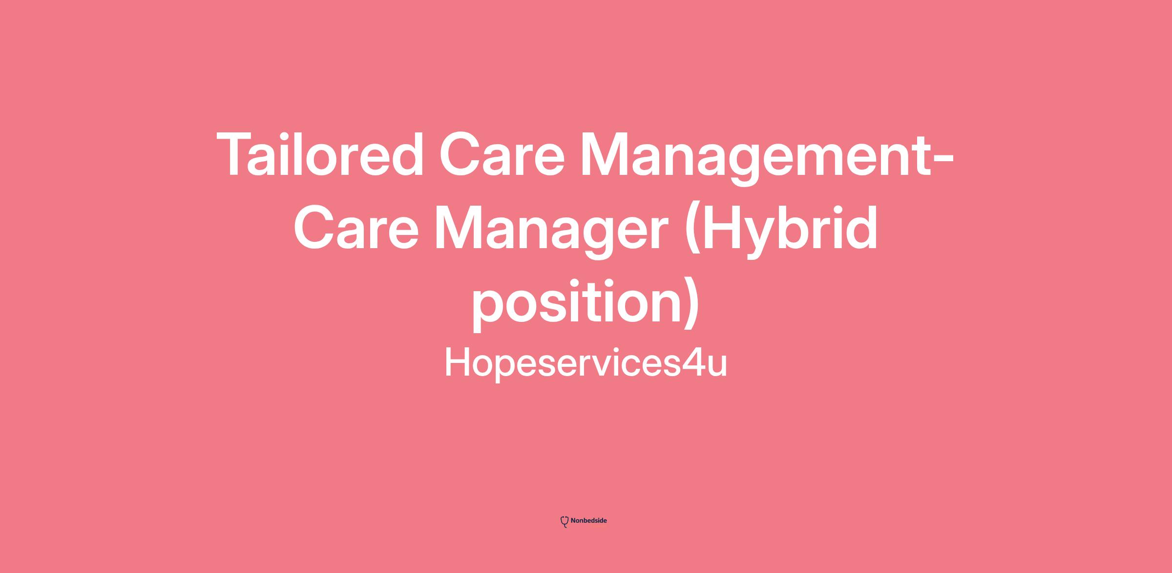 Hope Services, LLC is seeking a Care Manager within our Tailored Care Management Department. The applicant must be a qualified professional (not licensed or provisionally licensed). The primary responsibilities of the Care Manager include promoting whole-person, integrated care by planning, coordinating, tracking, and closing gaps in care, as well as monitoring care to help individuals achieve the goals outlined in their behavioral health tailored plans. The Care Manager will report to the Care Manager Supervisor.