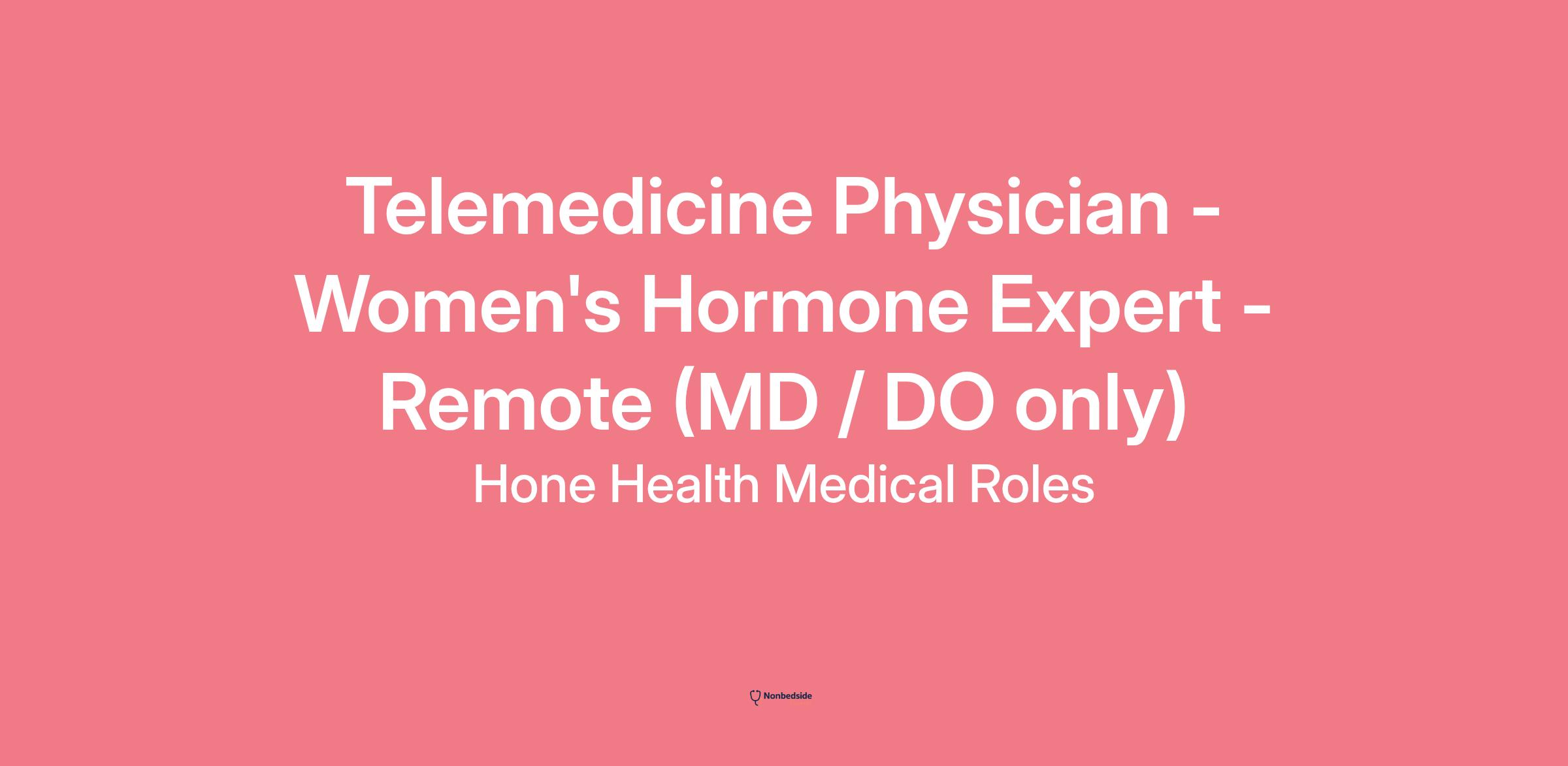 Work from any location, determine your own schedule, and earn extra income while helping women optimize their health and hormone levels with one of the fastest-growing health companies in the country. Seeking Obstetrics / Gynecology, Internal Medicine, or Family Medicine physicians, and all other physicians with deep knowledge and experience in prescribing for midlife women's healthcare. Please review and respond to the four applicant qualification questions we ask of our applicants at the bottom. We are specifically looking for physicians who specialize in women's health and have experience prescribing estrogen, progesterone, compounded medications, testosterone, and other hormone-boosting pharmaceuticals. Our services also include men's hormone, weight loss and thyroid treatment and we would prefer to bring on physicians who have experience prescribing for patients in some or all of those categories as well. We are currently looking for physicians nationwide and highly value physicians who are licensed in multiple states.