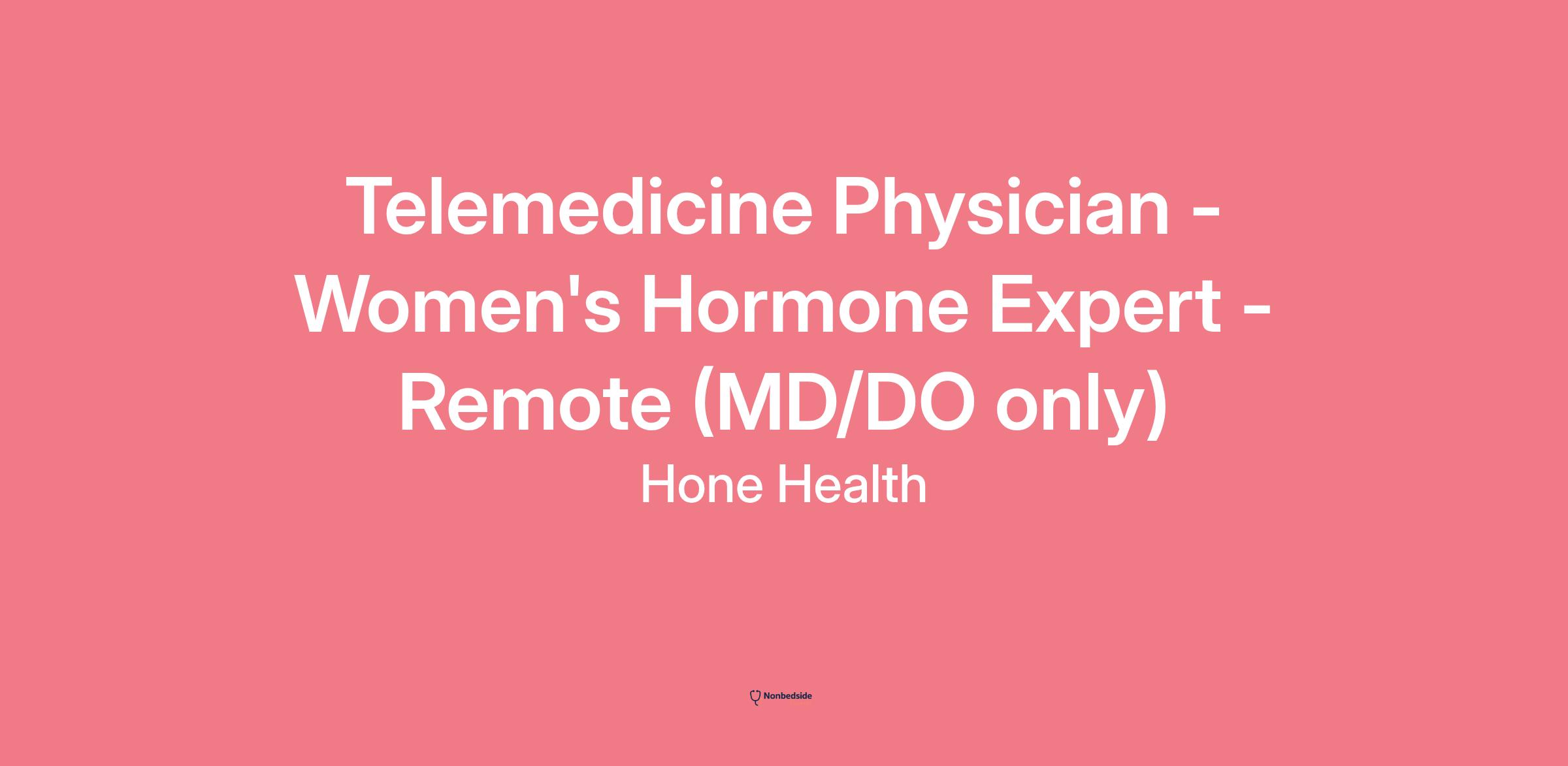 Telemedicine Physician - Women's Hormone Expert - Remote (MD/DO only) Join to apply for the Telemedicine Physician - Women's Hormone Expert - Remote (MD/DO only) role at Hone Health