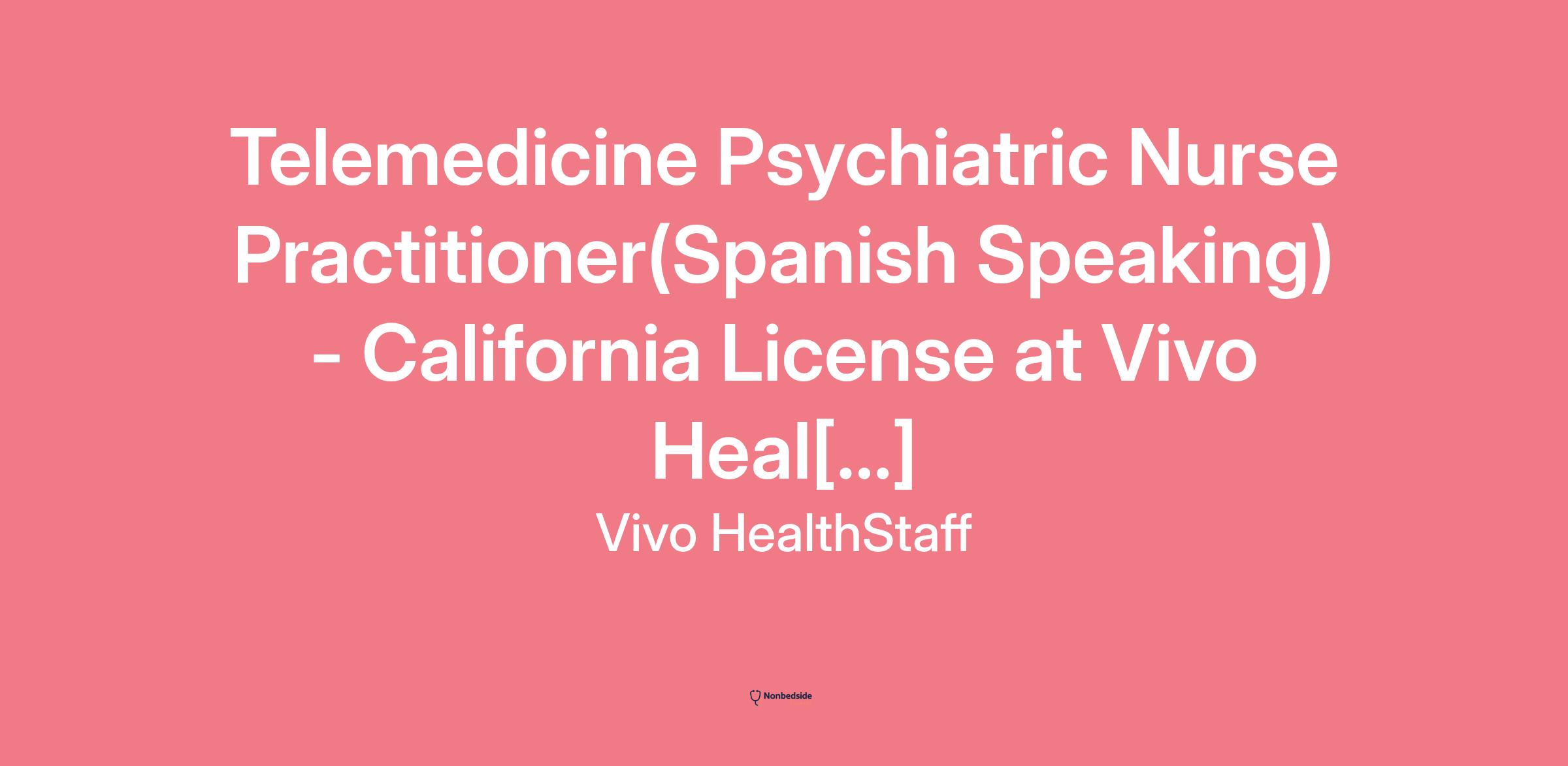Overview Vivo HealthStaff is hiring a Telemedicine Psychiatric Nurse Practitioner with active licensure in California . This position supports a community mental health non-profit. Location listed as Memphis, TN.