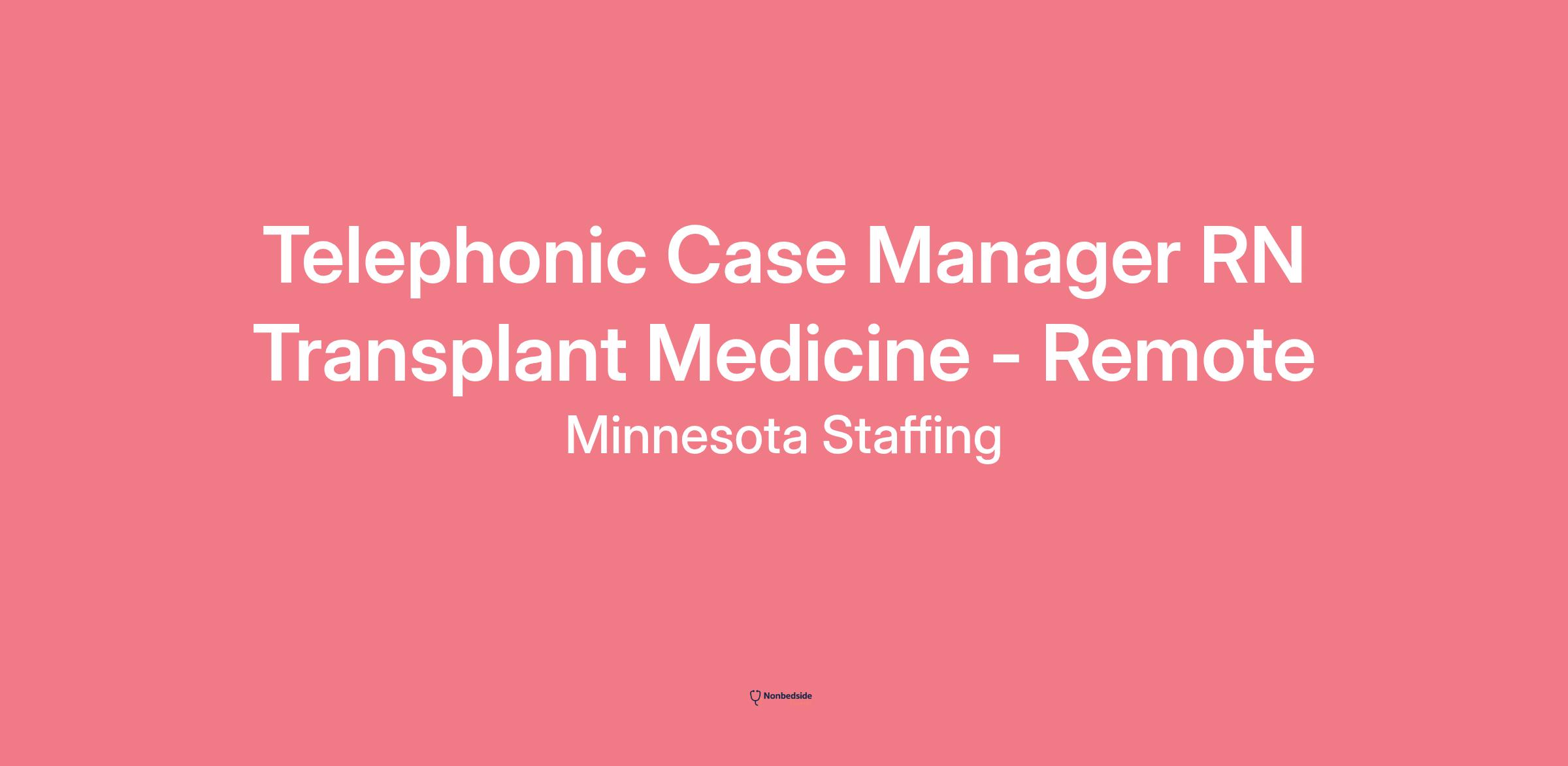 Optum is a global organization that delivers care, aided by technology to help millions of people live healthier lives. The work you do with our team will directly improve health outcomes by connecting people with the care, pharmacy benefits, data and resources they need to feel their best. Here, you will find a culture guided by inclusion, talented peers, comprehensive benefits and career development opportunities. Come make an impact on the communities we serve as you help us advance health optimization on a global scale. Join us to start Caring. Connecting. Growing together. We're making a solid connection between exceptional patient care and outstanding career opportunities. The result is a culture of performance that's driving the health care industry forward. As a Telephone Case Manager RN with UnitedHealth Group, you'll support a diverse member population with education, advocacy and connections to the resources they need to feel better and get well. Instead of seeing a handful of patients each day, your work may affect millions for years to come. Ready for a new path? Apply today!