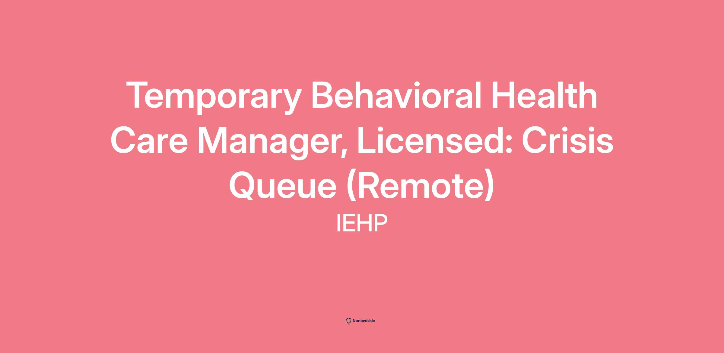 Temporary Behavioral Health Care Manager, Licensed Join to apply for the Temporary Behavioral Health Care Manager, Licensed role at IEHP .